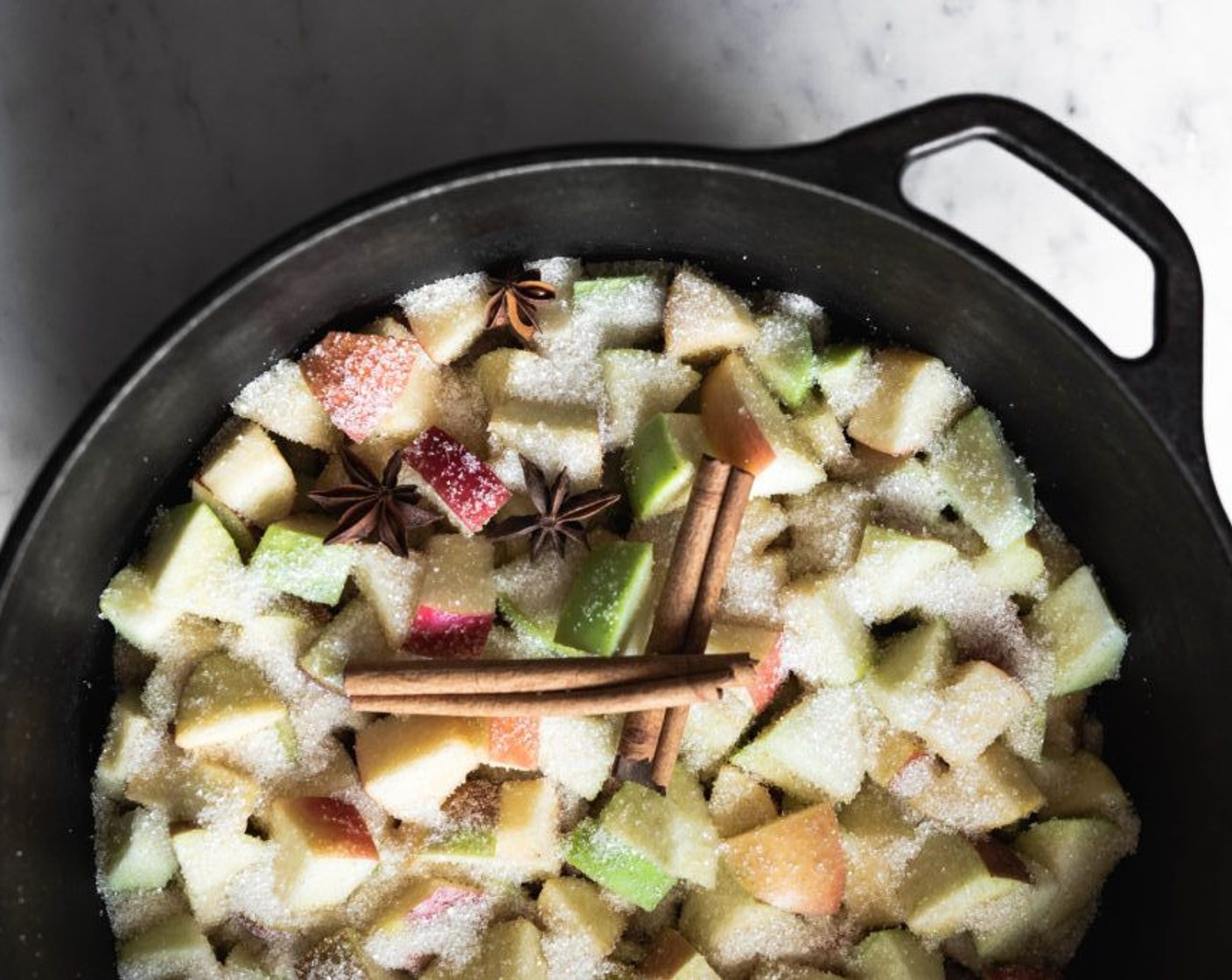 Äpfel (1.4 kg) zusammen mit Wasser (240 ml), Zucker (65 g), Zimtstange (1) und Sternanis (3) in eine Pfanne geben.