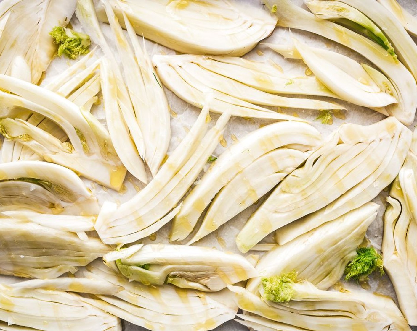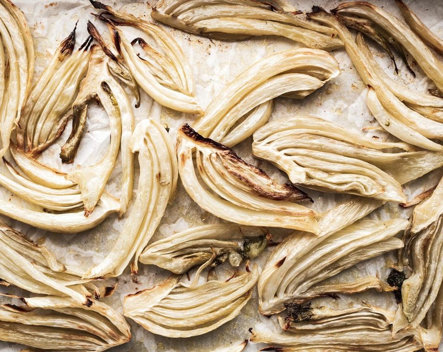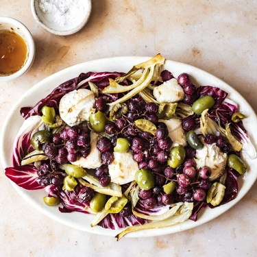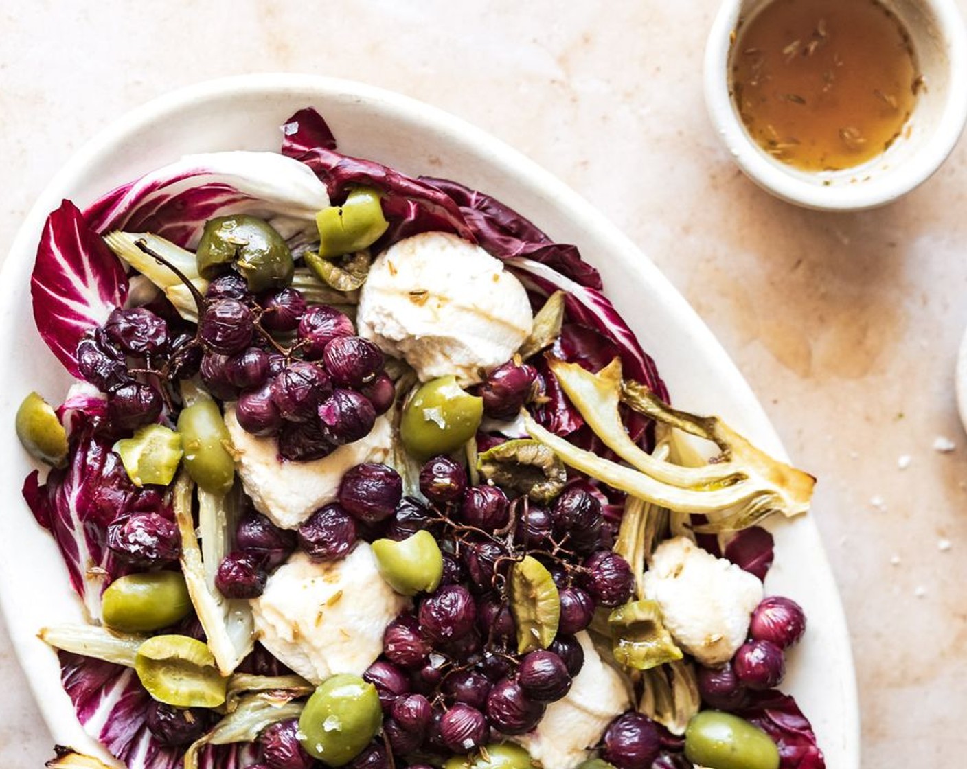 Die satten Farbtöne des Radicchio und der gerösteten Trauben im Kontrast zu den erdigen grünen Oliven und dem goldenen karamellisierten Fenchel ergeben eine Farbpalette, die Herzen glücklich macht. Ein Highlight der Saison, während der Sommer dem Herbst weicht – dieser Salat ist alles, was wir im Moment lieben und brauchen!