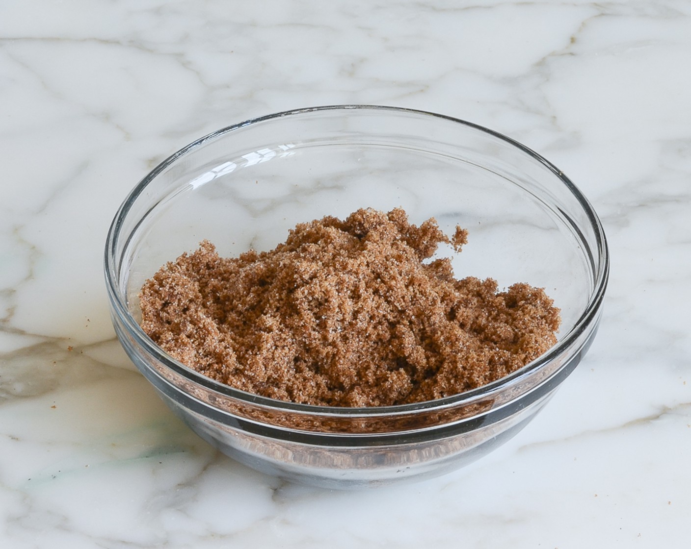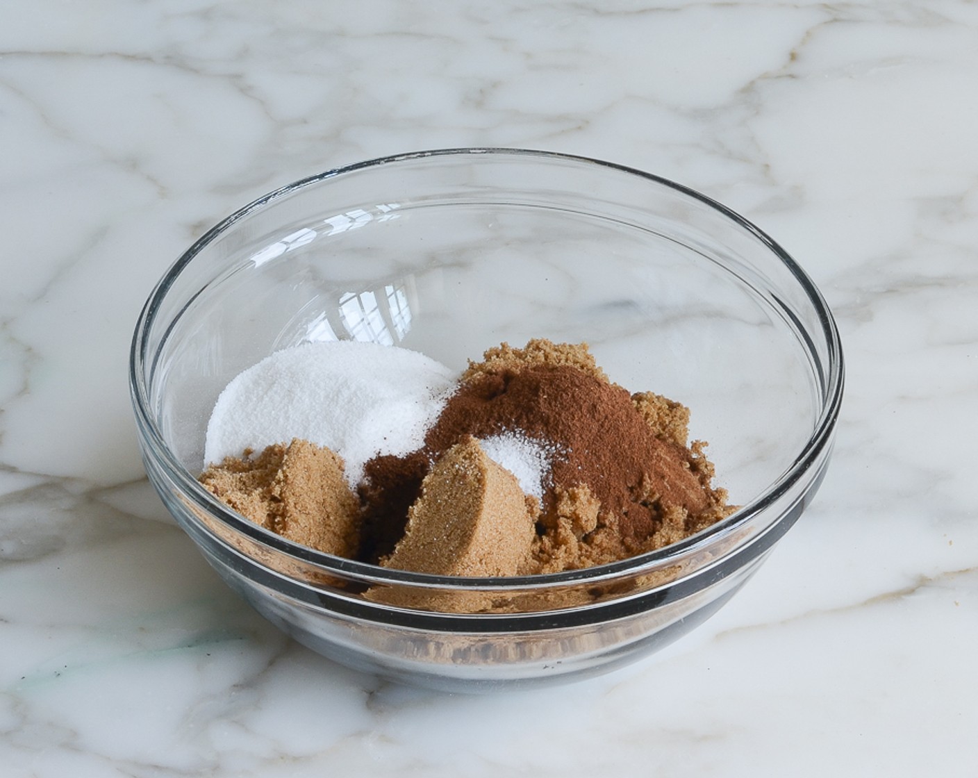 Braunen Zucker (145 g), Zucker (3 Esslöffel), Zimt (2 Teelöffel), Nelken (1/8 TL) und Salz (1/8 TL) mischen.