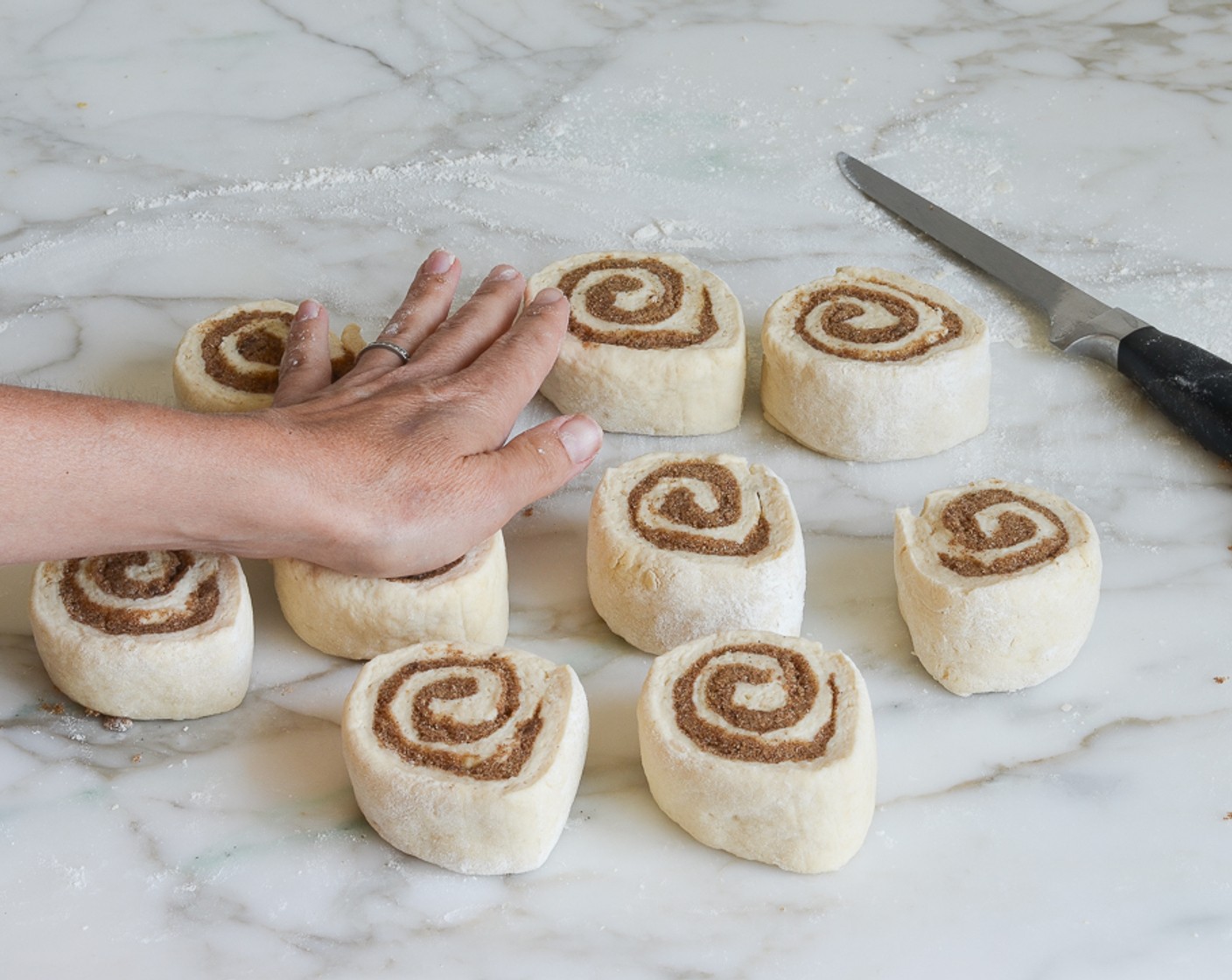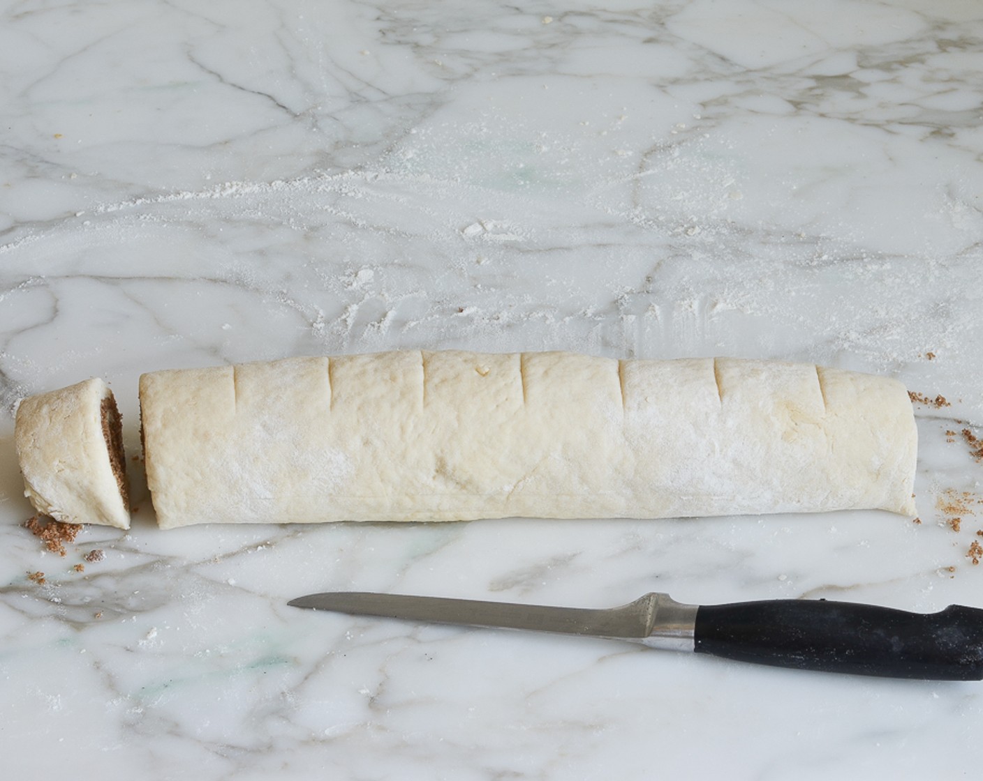 Die Rolle mit einem scharfen Messer gleichmässig in 9 Stücke schneiden.