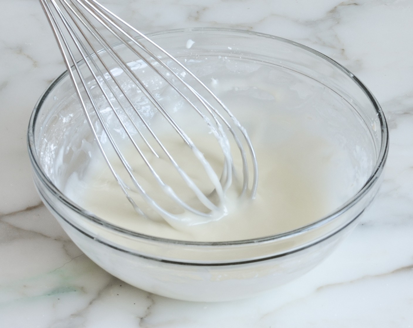 In der Zwischenzeit die Glasur zubereiten: In einer mittelgrossen Schüssel Frischkäse (1 1/2 Esslöffel) und Buttermilch (2 Esslöffel) verquirlen, bis die Masse dick und glatt ist. Puderzucker (90 g) hinzufügen und zu einer glatten Glasur verrühren.