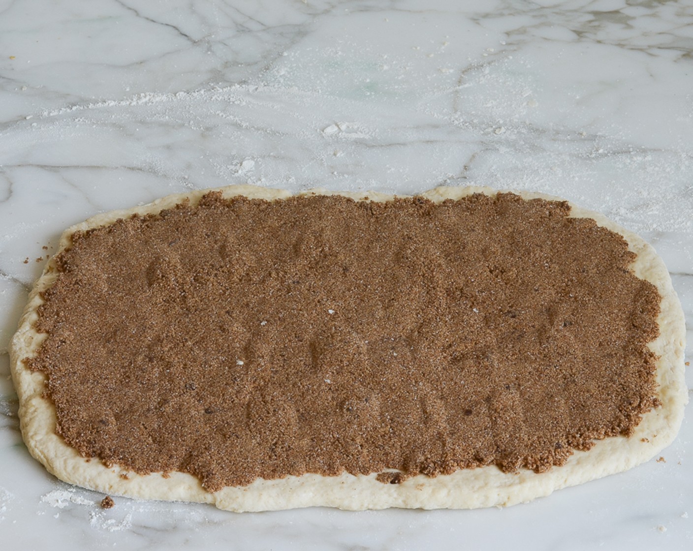 Teig mit geschmolzener Butter (1 EL) bestreichen und gleichmässig mit der braunen Zuckerfüllung belegen. Dabei einen Rand von etwa 3 cm frei lassen. Die Füllung mit der Hand fest in den Teig drücken.