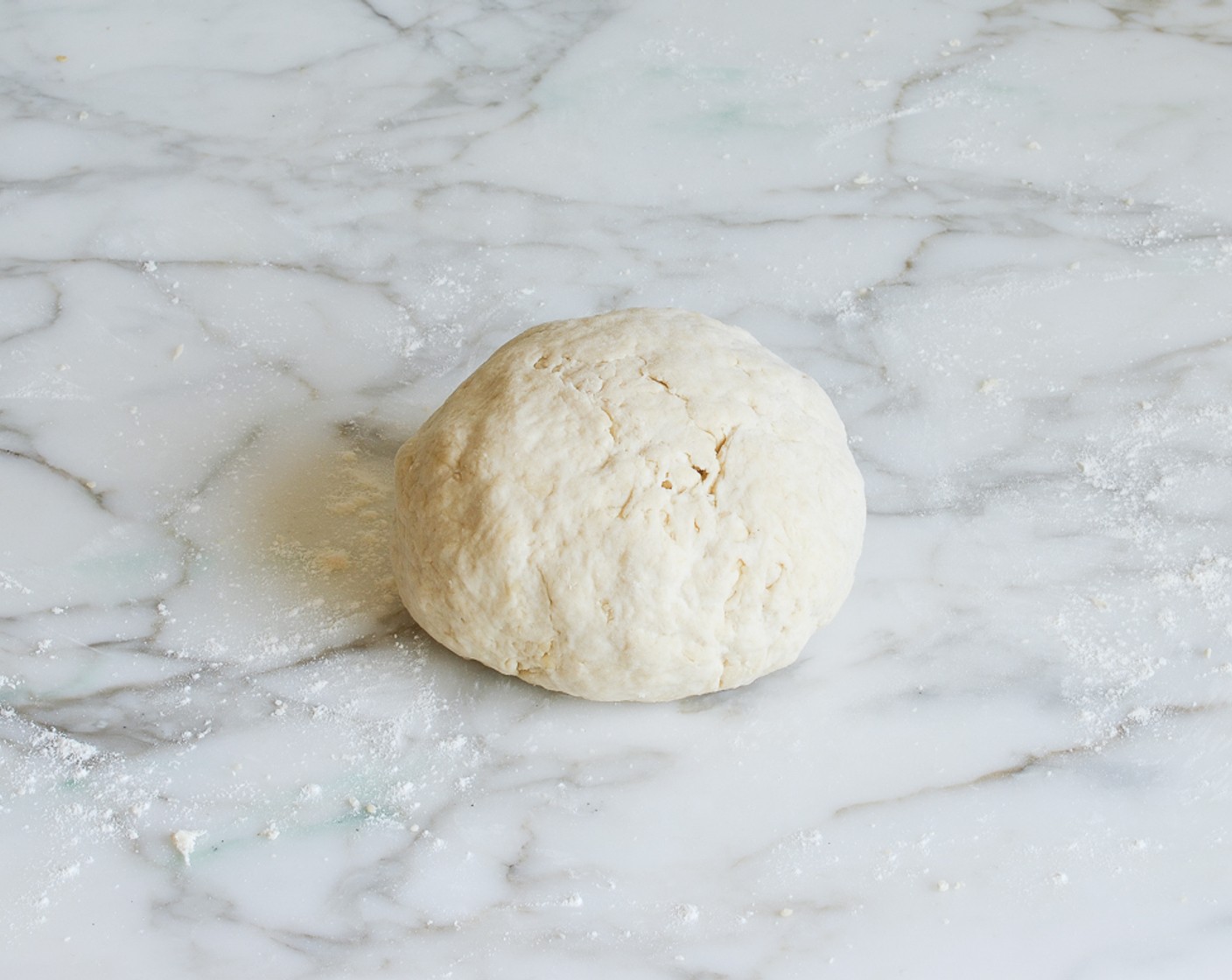 Den Teig auf eine leicht bemehlte Arbeitsfläche geben. Etwa 30 Sekunden kneten, bis der Teig glatt ist.