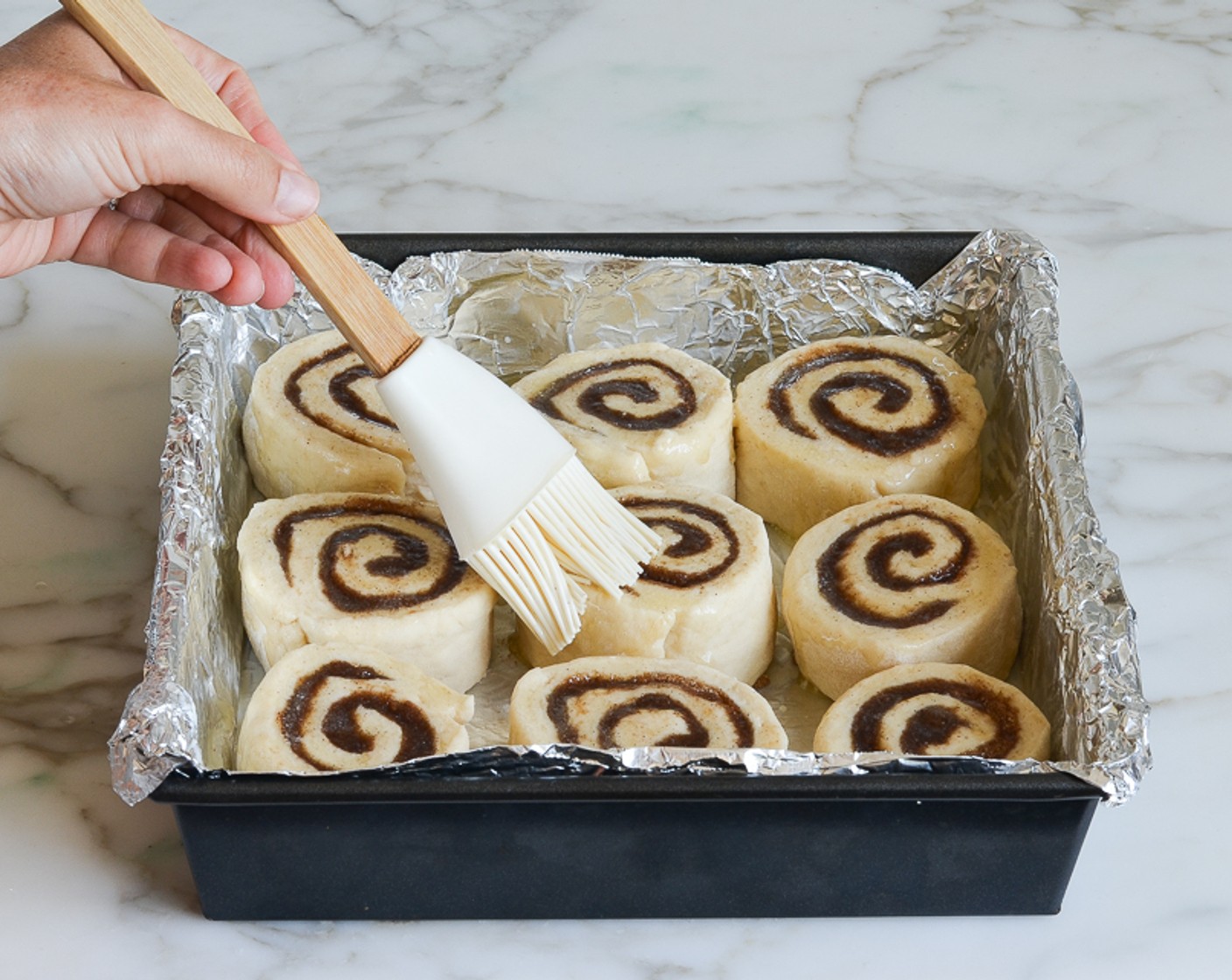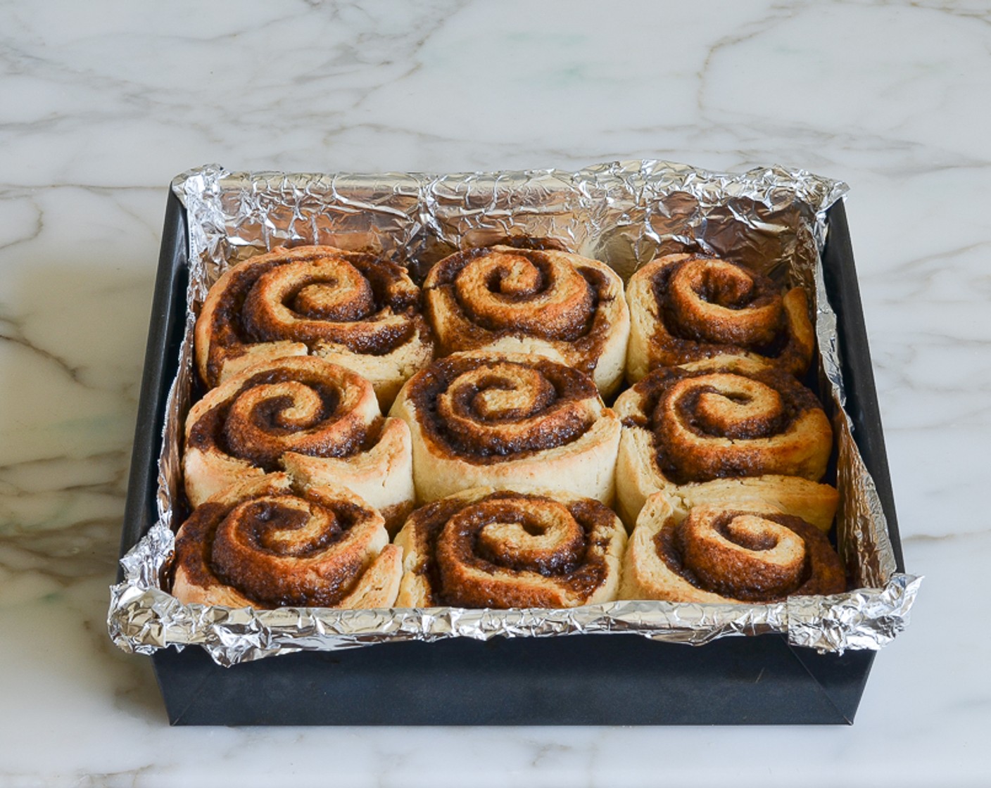 Wenn die Zimtschnecken fertig sind, mit der Folie aus der Backform heben und auf ein Gitterrost legen. 5 Minuten abkühlen lassen, dann vorsichtig mit einem Messer trennen.
