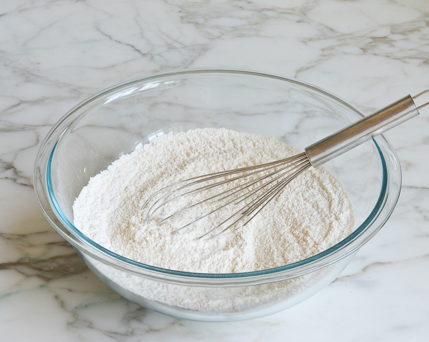 In einer anderen grossen Schüssel Mehl (375 g), Zucker (2 Esslöffel), Backpulver (1 TL), Natron (1/2 TL) und Salz (1/2 TL) mischen.