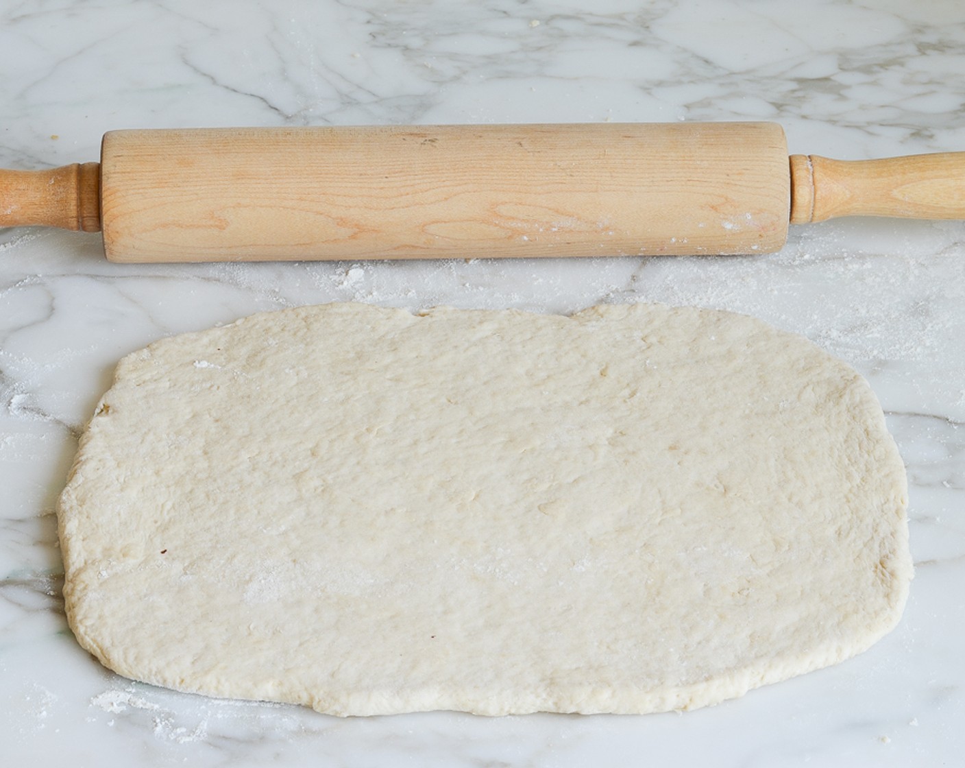 Die Oberfläche erneut mit wenig Mehl bestäuben. Den Teig ausbreiten und zu einem 12 × 20 cm grossen Rechteck ausrollen. Dabei bei Bedarf erneut sparsam mit Mehl bestäuben, damit der Teig nicht am Nudelholz kleben bleibt.