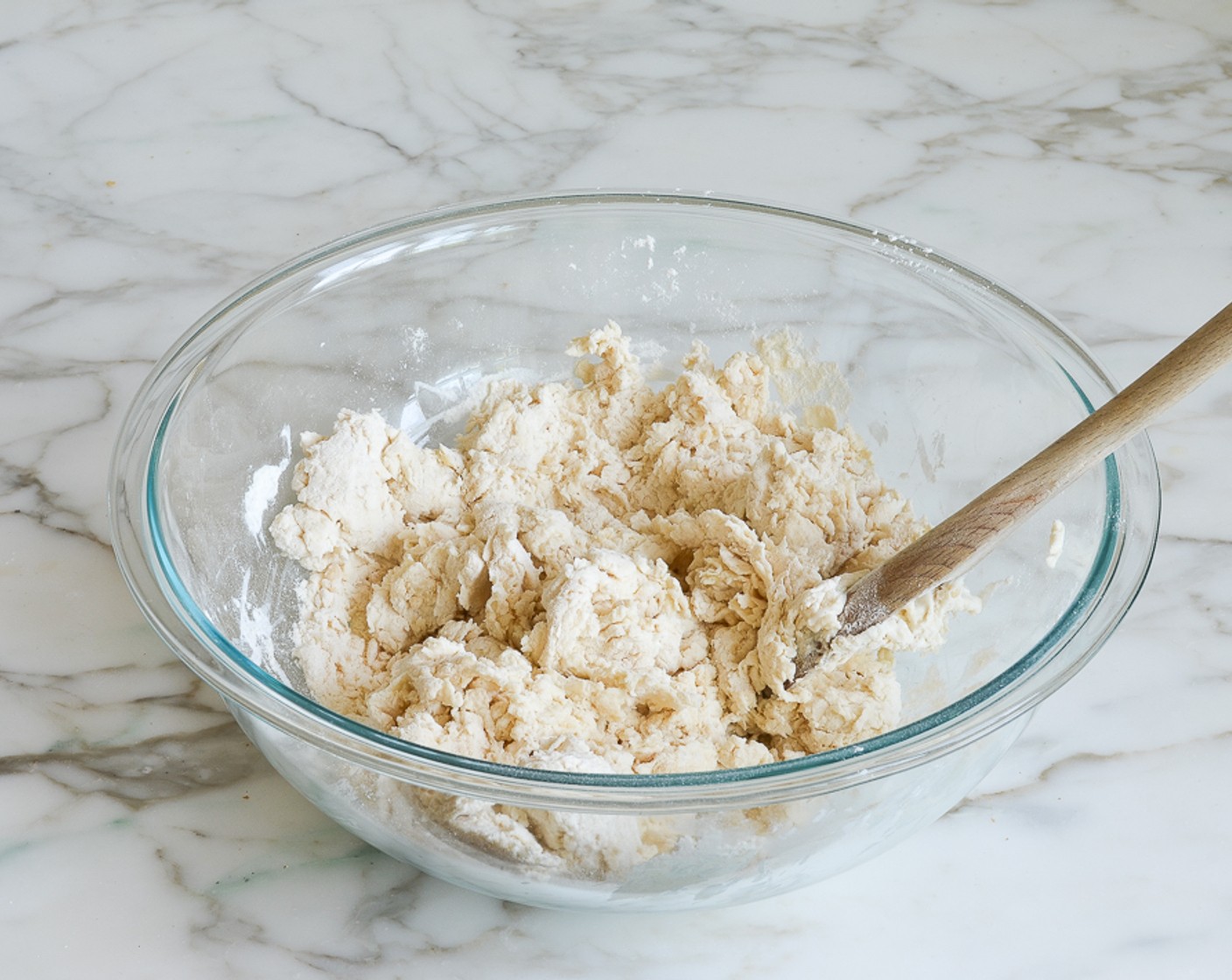 Geschmolzene Butter (3 Esslöffel) und Buttermilch (300 ml) zu den trockenen Zutaten geben und mit einem Holzlöffel etwa 30 Sekunden umrühren, bis die Flüssigkeit aufgesogen ist und der Teig klebriger wird.