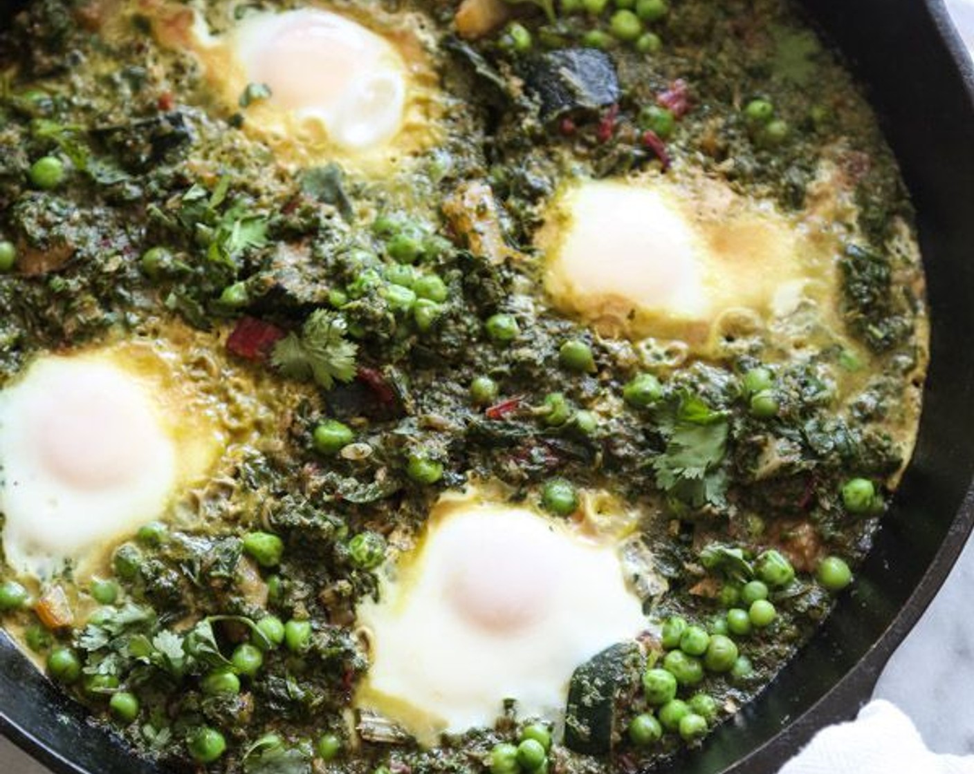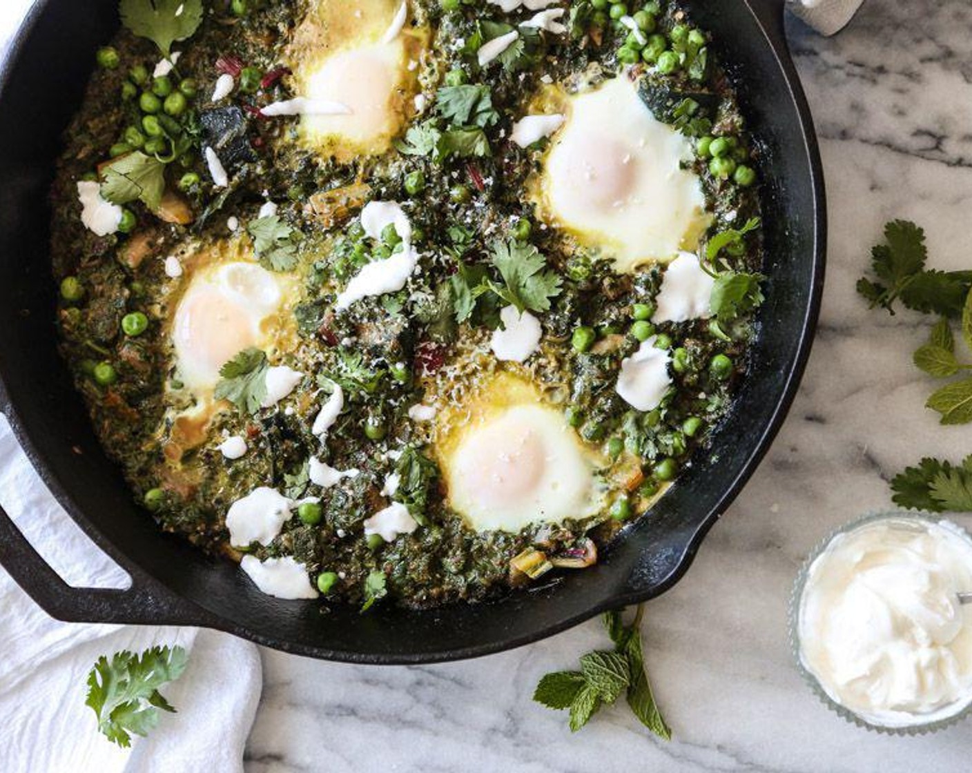 Diese einfache grüne Shakshuka ist eine Abwandlung des klassischen israelischen Gerichts mit gebackenen Eiern. Anstelle der gewürzten Tomatensoße besteht die Basis aus einer Mischung aus Mangold, Erbsen, Zucchini, Koriander und anderen grünen Zutaten. Essen Sie es als gesundes fleischloses Montagsgericht oder als würziges, spritziges Frühstück am Wochenende.