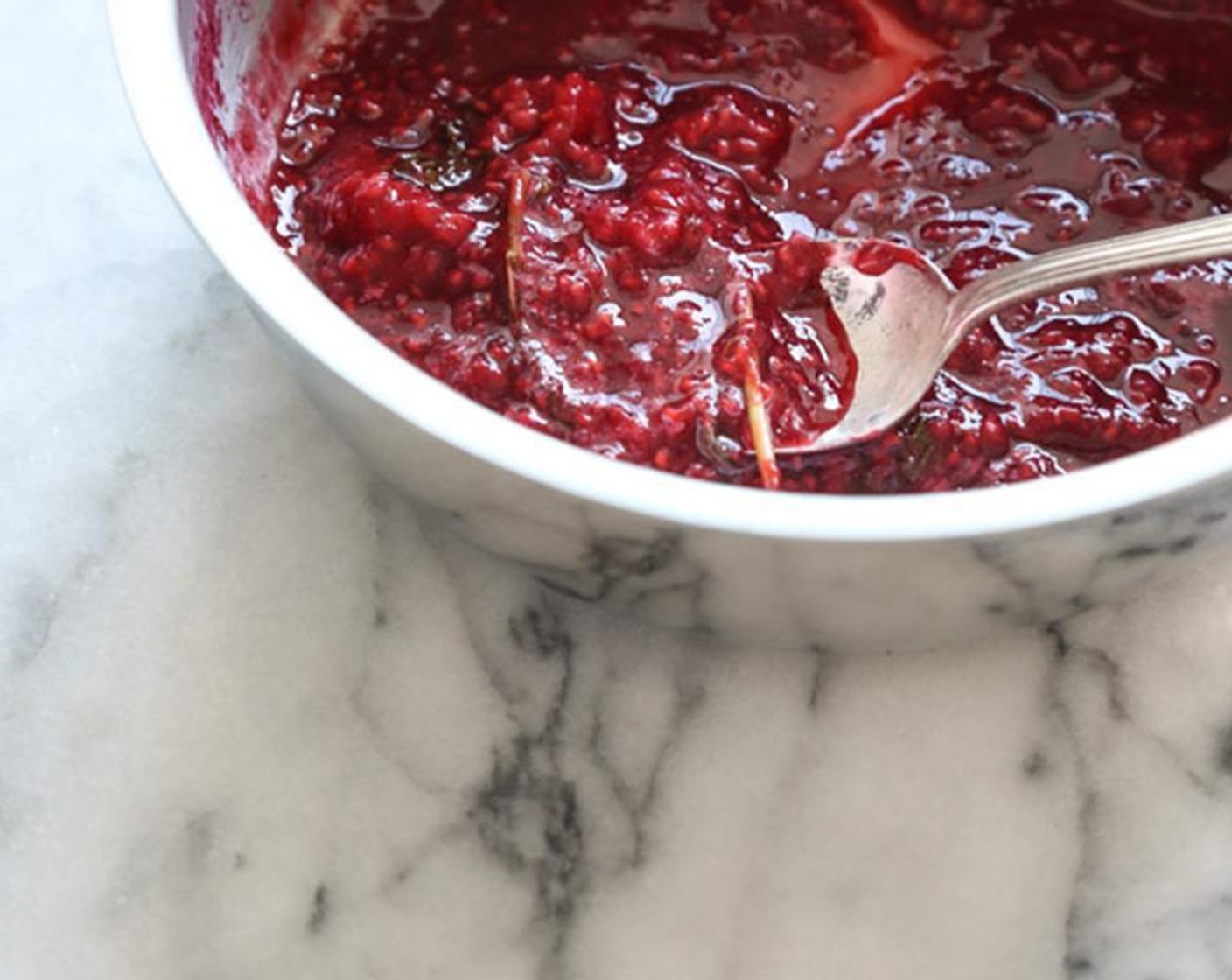 Die Mischung zum köcheln bringen und bei mittlerer Hitze unter gelegentlichem Rühren etwa 5 Minuten lang kochen, bis die Himbeeren zu einem groben Brei zerfallen sind.