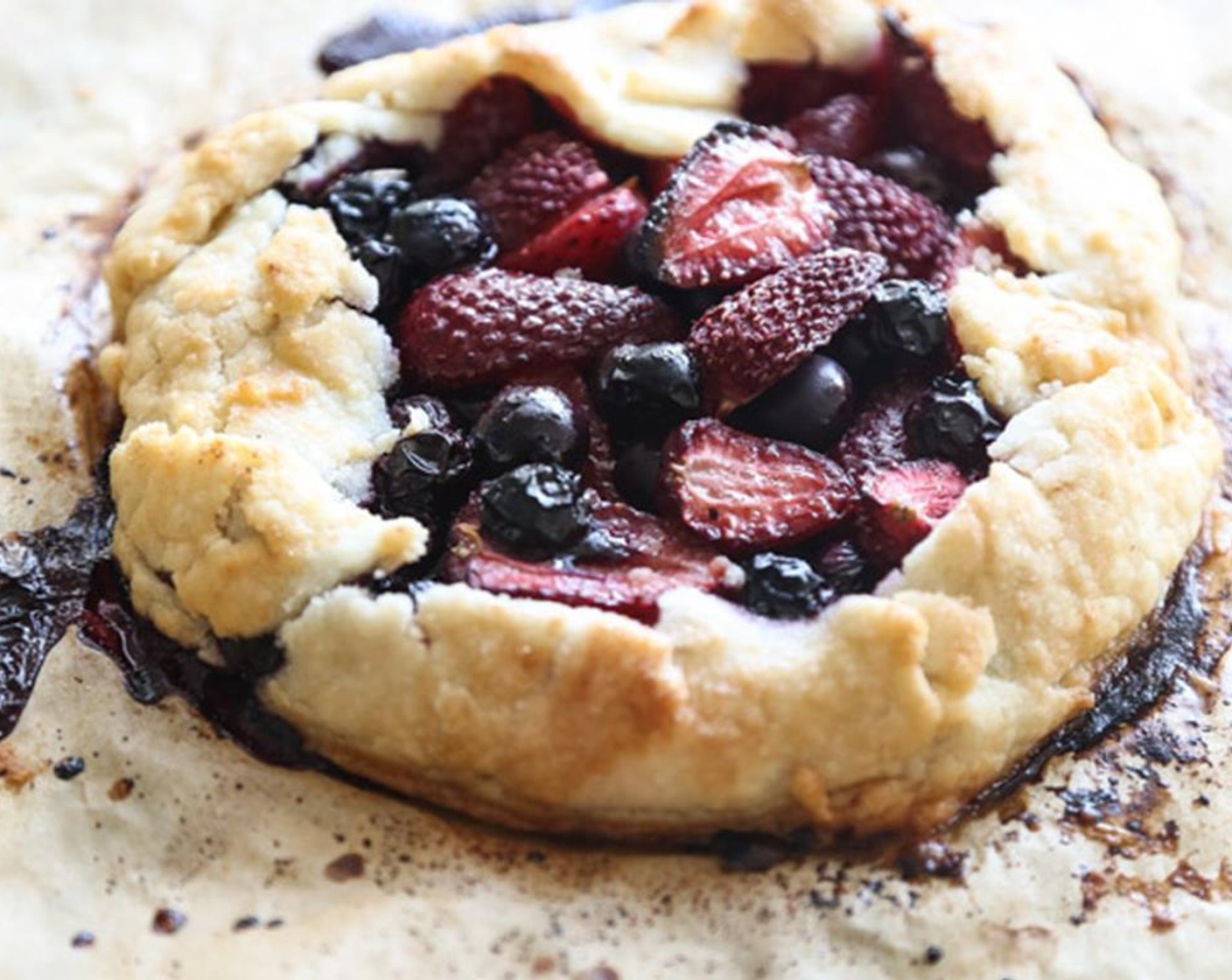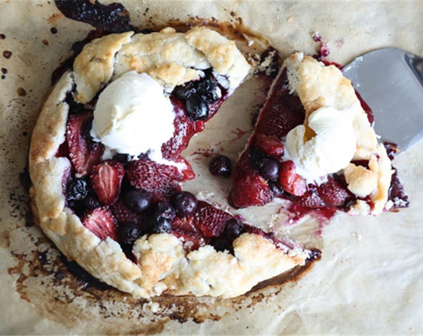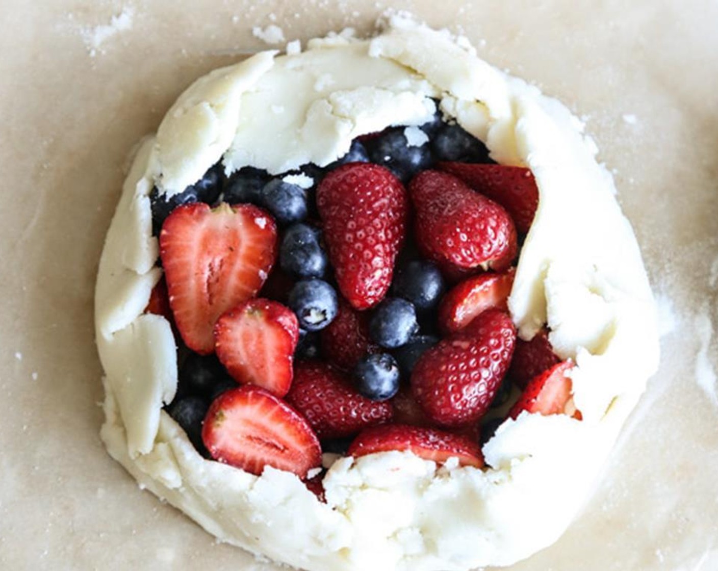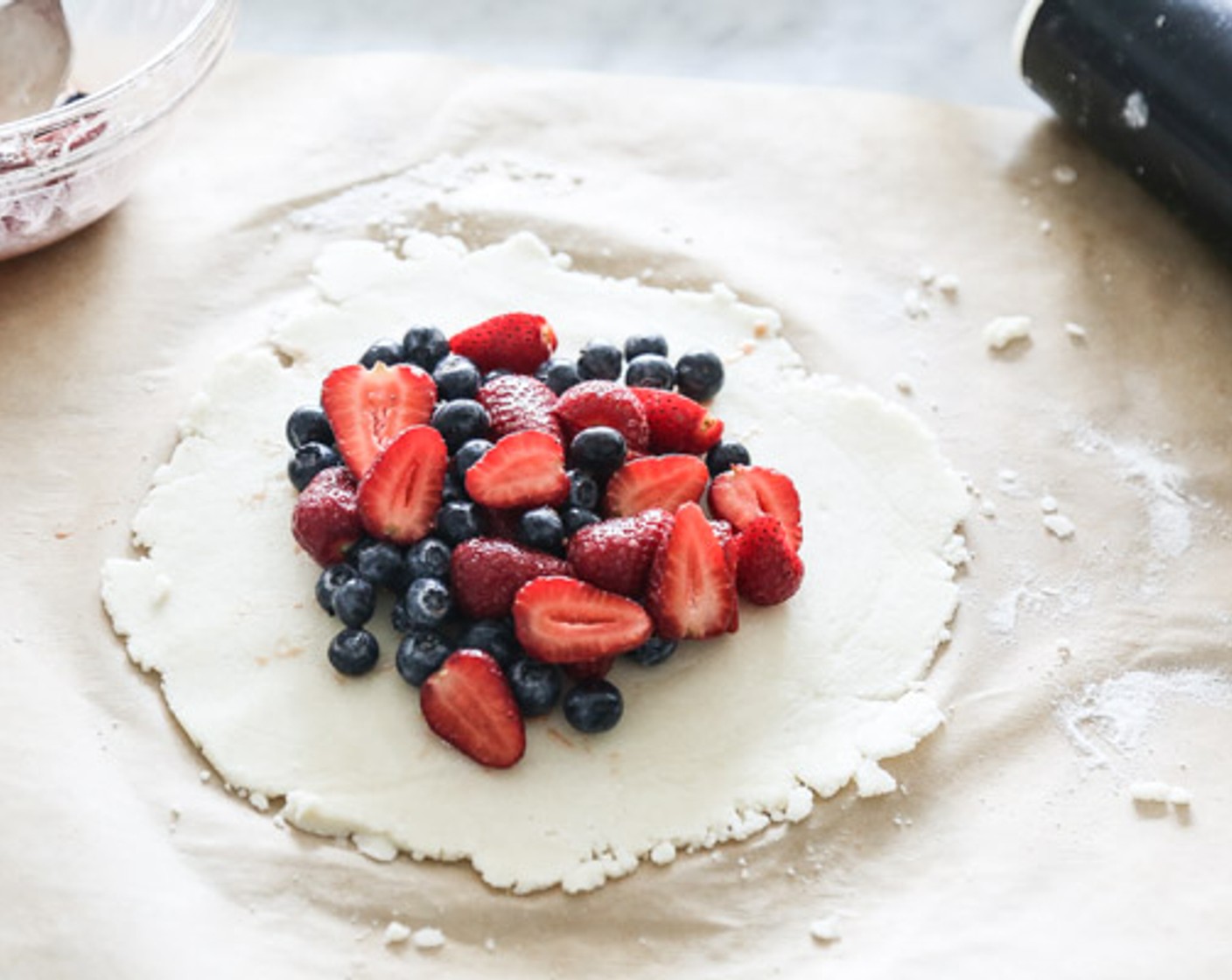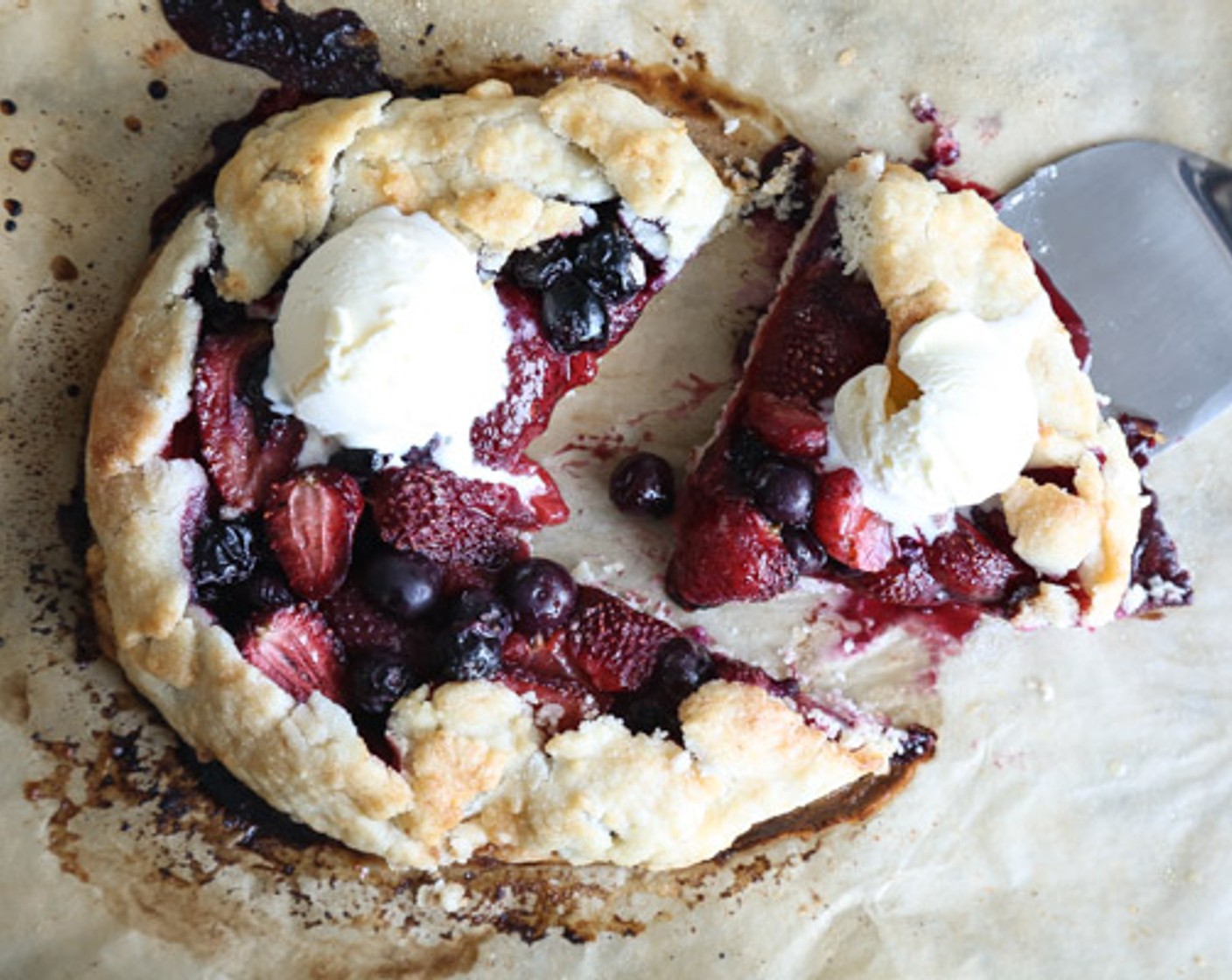 Diese glutenfreie Galette mit Erdbeeren und Heidelbeeren ist eine unkomplizierte Tarte, die ebenso schick und mühelos ist, wie sie schmeckt. Vollgepackt mit Erdbeeren und gekrönt mit Vanilleeis ist sie eine rot-weiß-blaue Wonne! Die Kruste war perfekt buttrig und flockig, die perfekte Ergänzung zu den triefenden, säuerlichen Beeren.