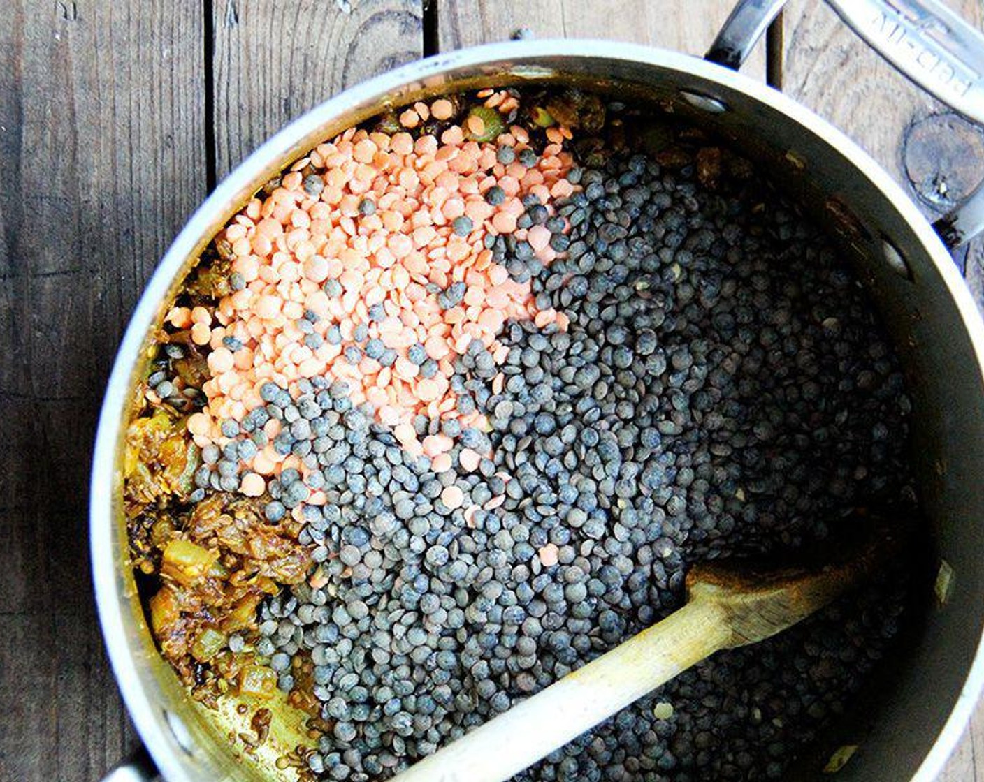 Dieses Zwei-Linsen-Dal ist nicht nur unglaublich lecker, sondern auch herrlich unkompliziert in der Zubereitung! Ja, ich weiss – es ist vielleicht ein bisschen pingelig, a) eine ganz bestimmte Linsensorte zu wählen und b) gleich zwei verschiedene zu kombinieren. Aber glaub mir: Es lohnt sich! Die kleinen französischen grünen Linsen behalten ihre Form und sorgen für Biss, während die roten (oder gelben, oder braunen) Linsen wunderbar zerfallen und dem Dal diese sämige, gemütliche Konsistenz verleihen.