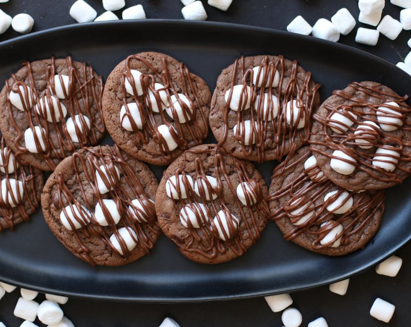 Zähe, schokoladige Kakao Cookies, die frisch zubereitet werden. Gefüllt mit Milchschokoladensplittern und gekrönt mit schmelzendem Marshmallows und beträufelt mit Milchschokolade...einfach wunderbar!