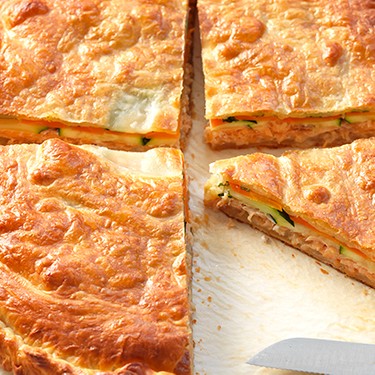 Den Blätterteig (1 Rolle) in die Kuchenform legen und ca. 1 cm überlappen lassen, mit der Gabel einstechen. Anschliessend den Rauchlachs (350 g) auf den Blätterteig legen, die Karotten und Zucchini darauf verteilen. Mit Salz (wenig) und Pfeffer (wenig) würzen.