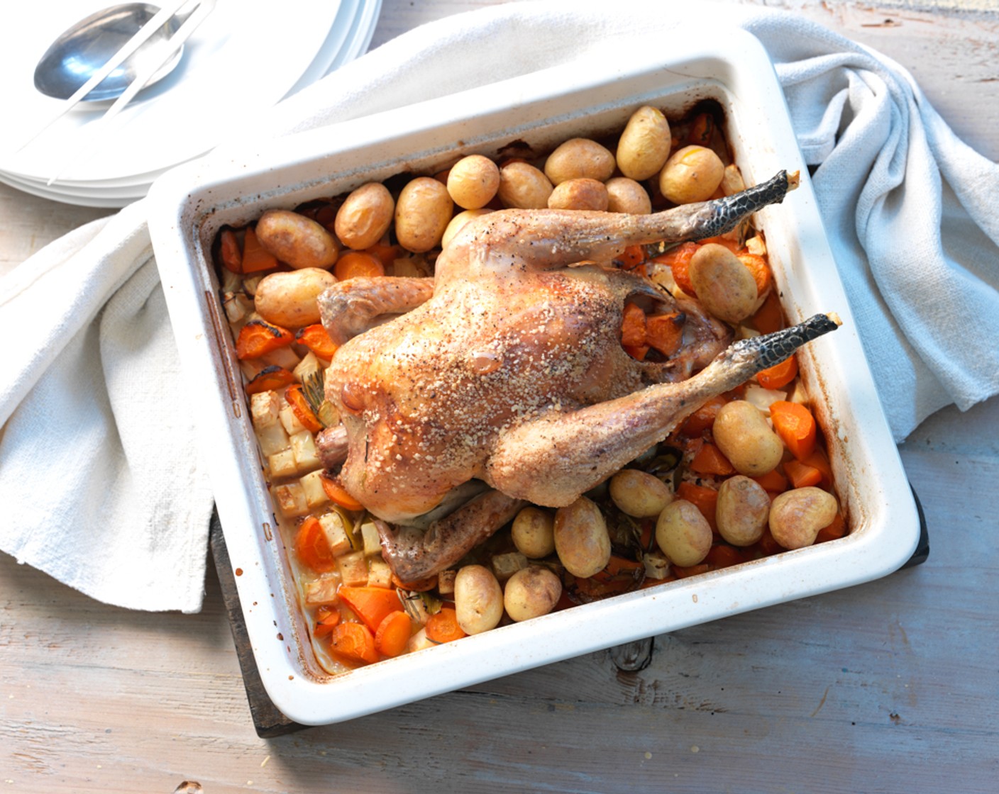 Ofenpoulet mit Wurzelgemüse und Kartoffeln