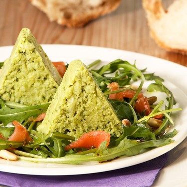 Den Rucola (15 g) grob hacken, zum Gemüse geben und alles fein pürieren. Das Ganze mit Salz (1 TL) und Pfeffer (wenig) würzen. Das Crème Fraîche (2 Esslöffel) und Eigelb (1) unterrühren.