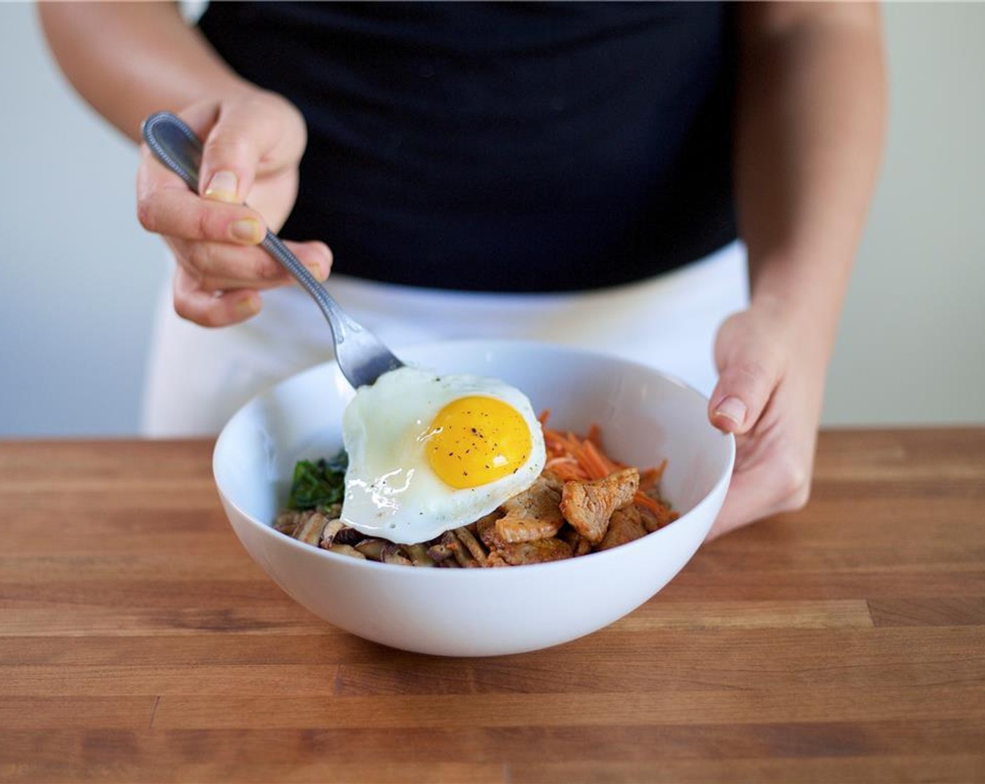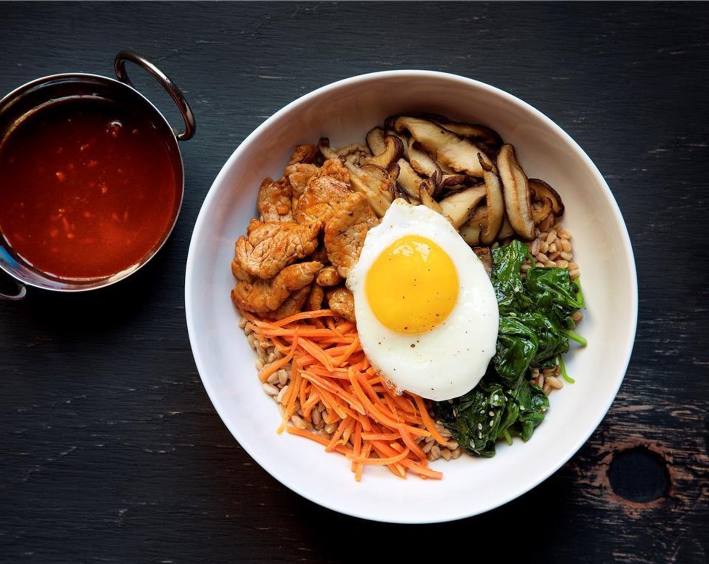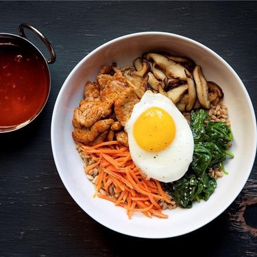 Zeit, dein Leben aufzupeppen! Dieses traditionelle koreanische Gericht erhält seine feurige Note von der Gochujang-Paste – der purpurroten Würze aus Chilischoten, Reis und Sojabohnen. Das Farro ist die Basis für zartes Schweinefleisch und frisches Gemüse. Ein herrliches Gericht mit Ei.
