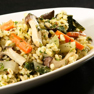 Zum Schluss das Ebly mit dem Gemüse und dem vorbereiteten Rucola-Pesto mischen, mit den beiseitegestellten Pinienkernen garnieren und mit Salz (wenig) und Pfeffer (wenig) würzen.