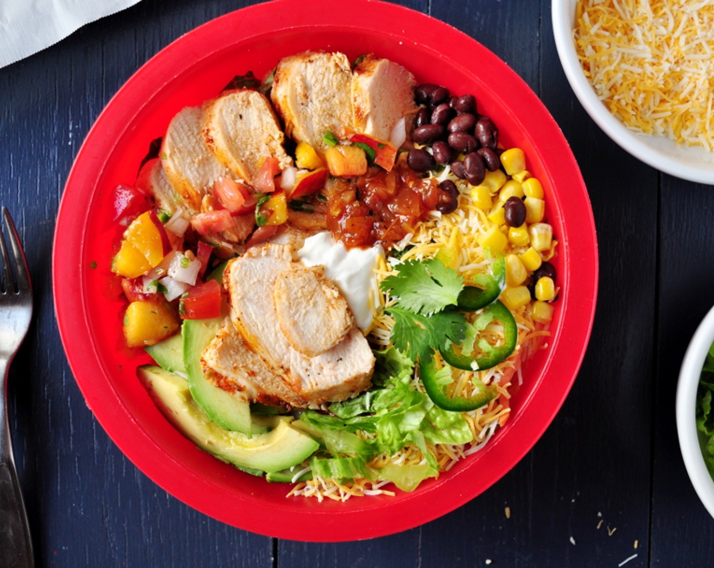 Eine gesunde und köstliche Burrito-Bowl mit gegrilltem Hühnchen. Dieses Gericht ist in weniger als 30 Minuten zubereitet.