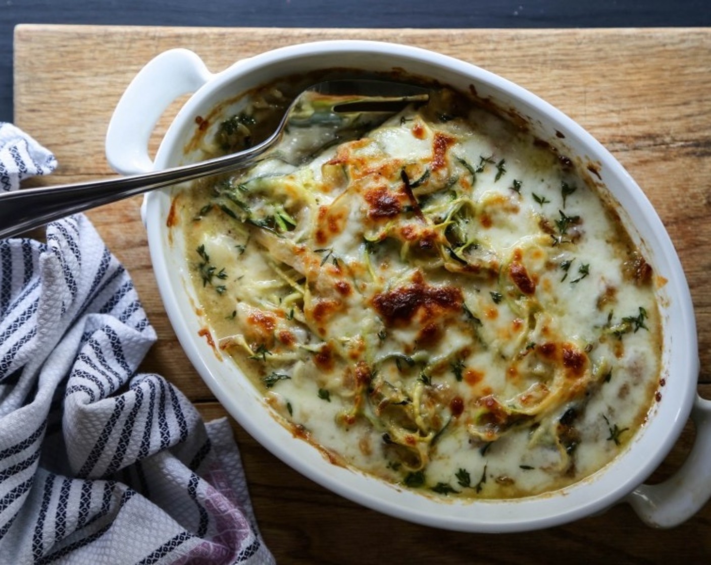 French Onion Zoodle Bake hat alle Aromen der klassischen französischen Suppe, aber mit einer gesunden, herzhaften Abwandlung!