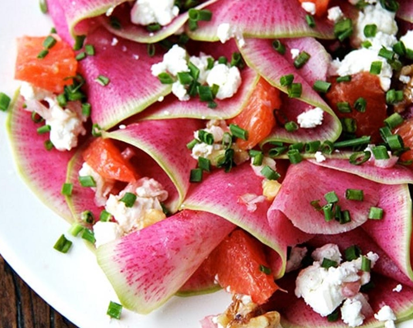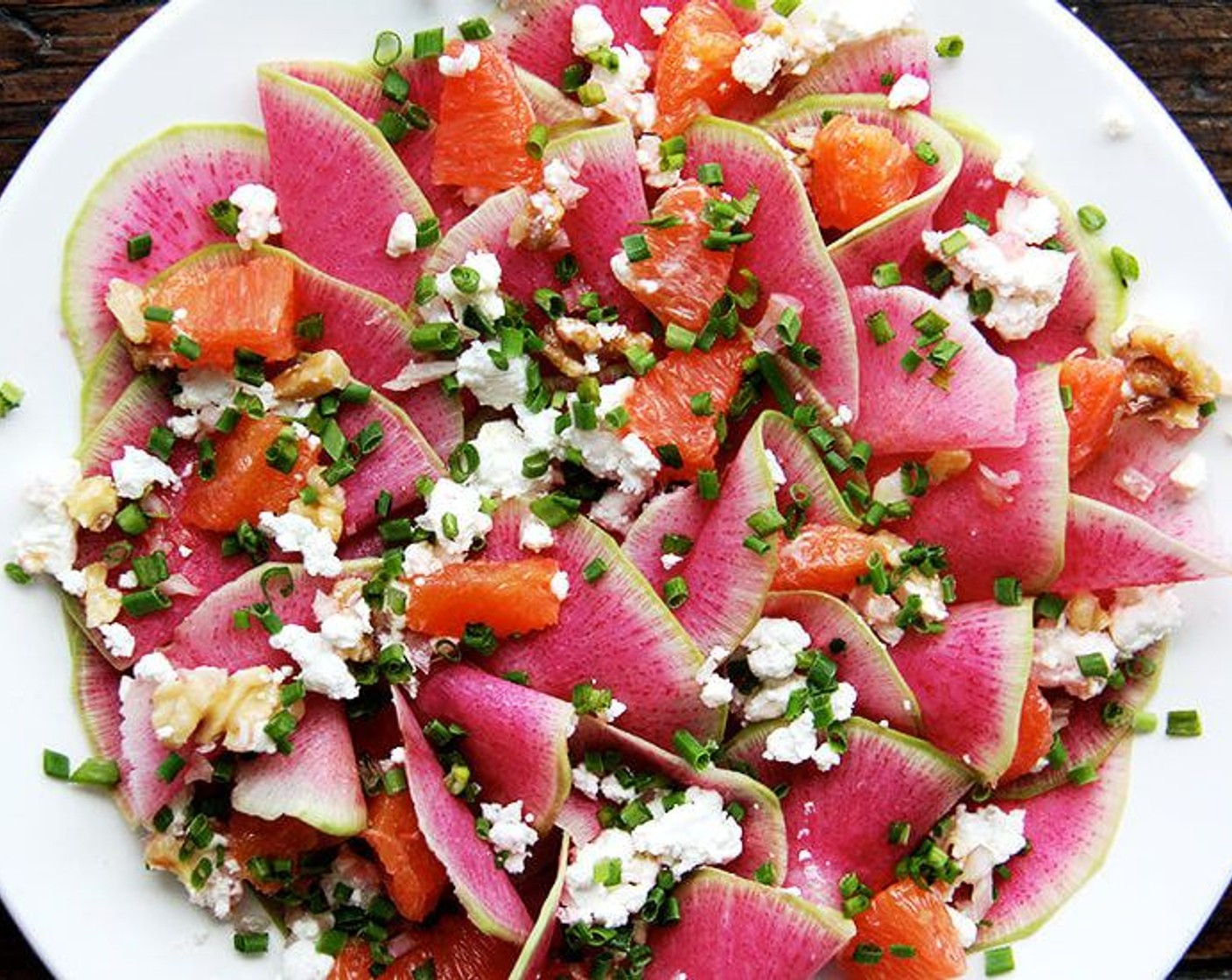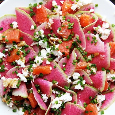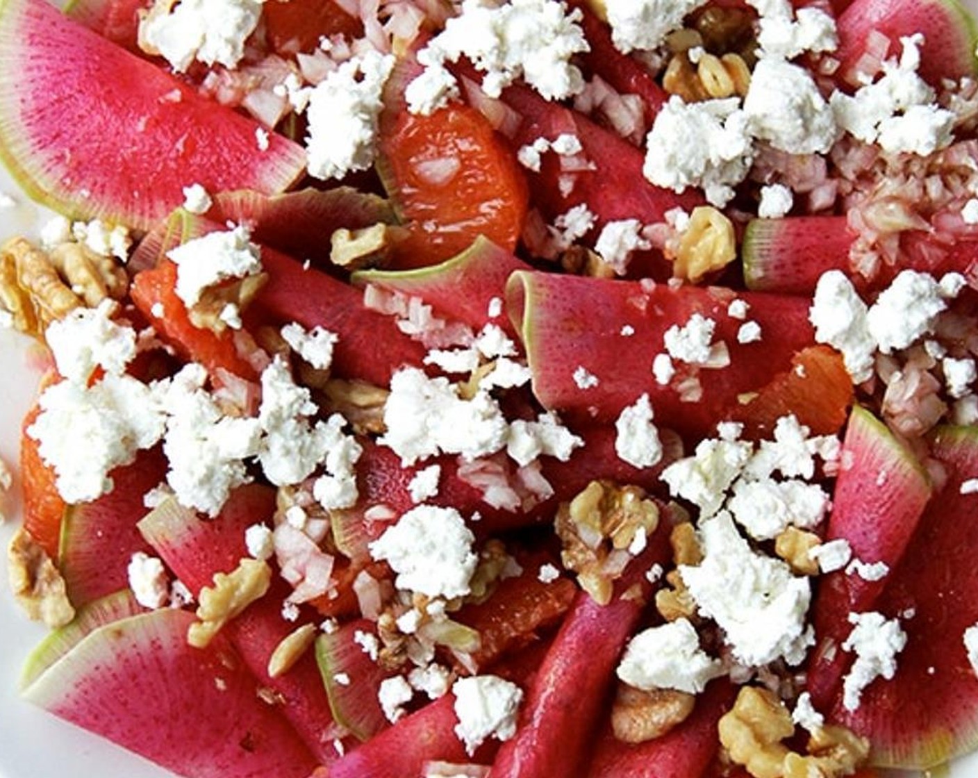 Ein einfacher Salat, inspiriert von einer Fülle von frischen Zutaten wie Wassermelonen-Rettich, auch Rabano Sanddia genannt und Zitrusfrüchten. Kombiniert mit einem kräftigen Ziegenkäse und knackigen Walnüssen ist der Salat ein gesundes und erfrischendes Mittagessen.