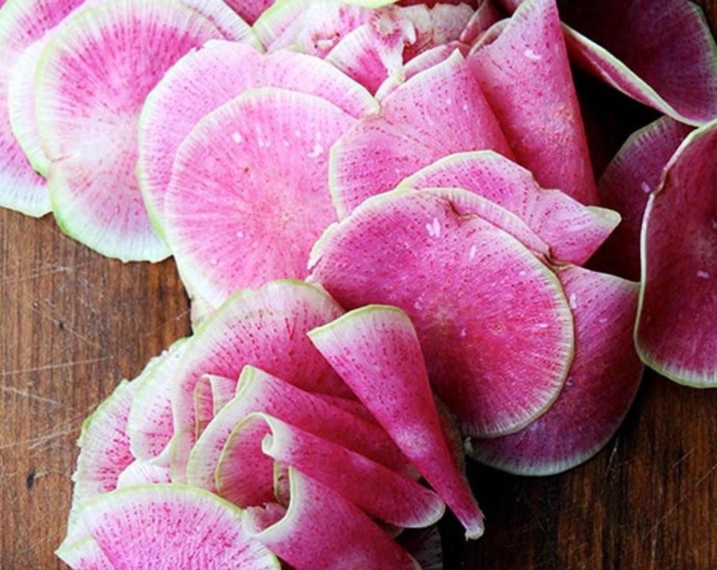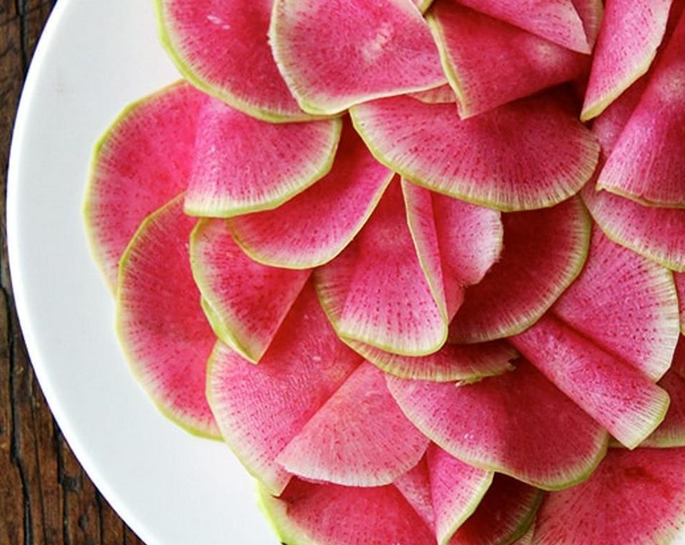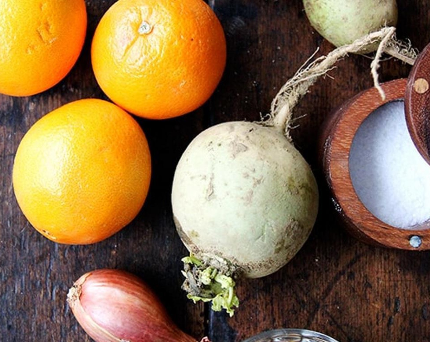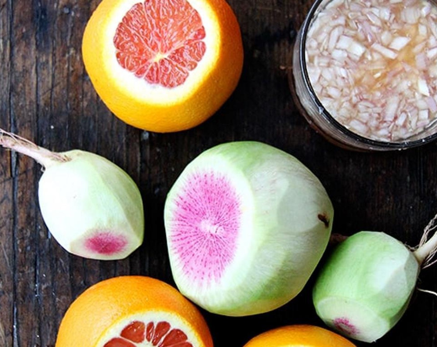 Ein einfacher Salat, inspiriert von einer Fülle von frischen Zutaten wie Wassermelonen-Rettich, auch Rabano Sanddia genannt und Zitrusfrüchten. Kombiniert mit einem kräftigen Ziegenkäse und knackigen Walnüssen ist der Salat ein gesundes und erfrischendes Mittagessen.