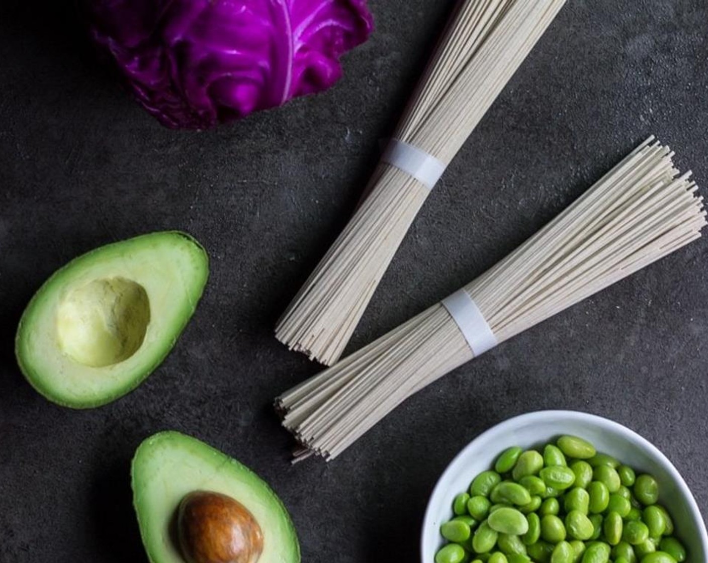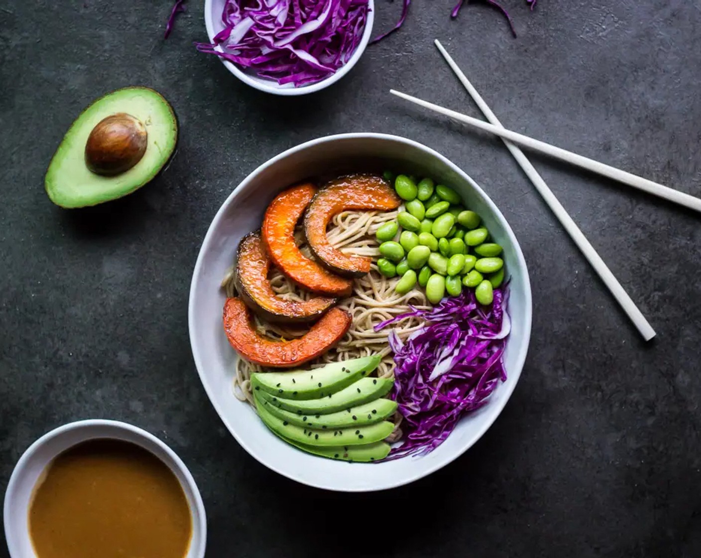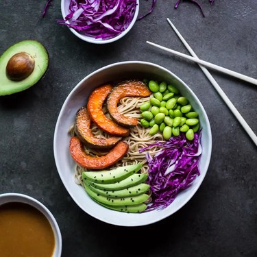 Soba kann kalt, heiss oder, wie in diesem Rezept, warm gegessen werden. Gehackter Kohl und Edamame geben der Kabocha Bowl Biss und Struktur. Avocado bringt die Cremigkeit in das Gericht.