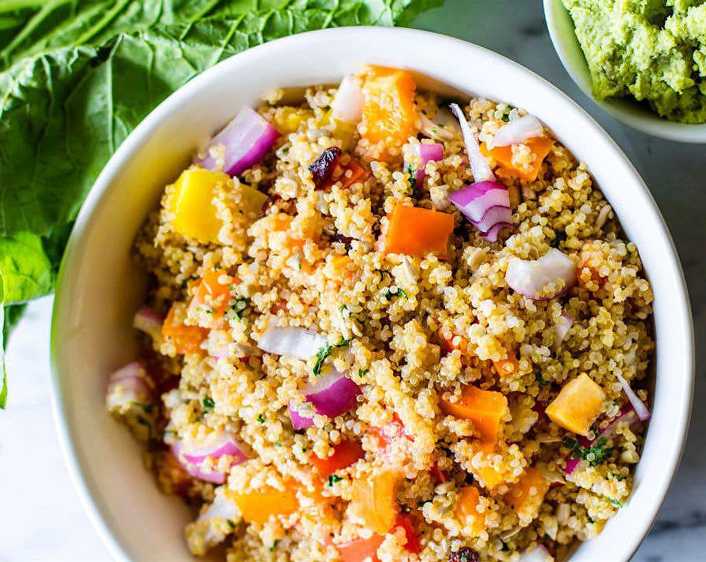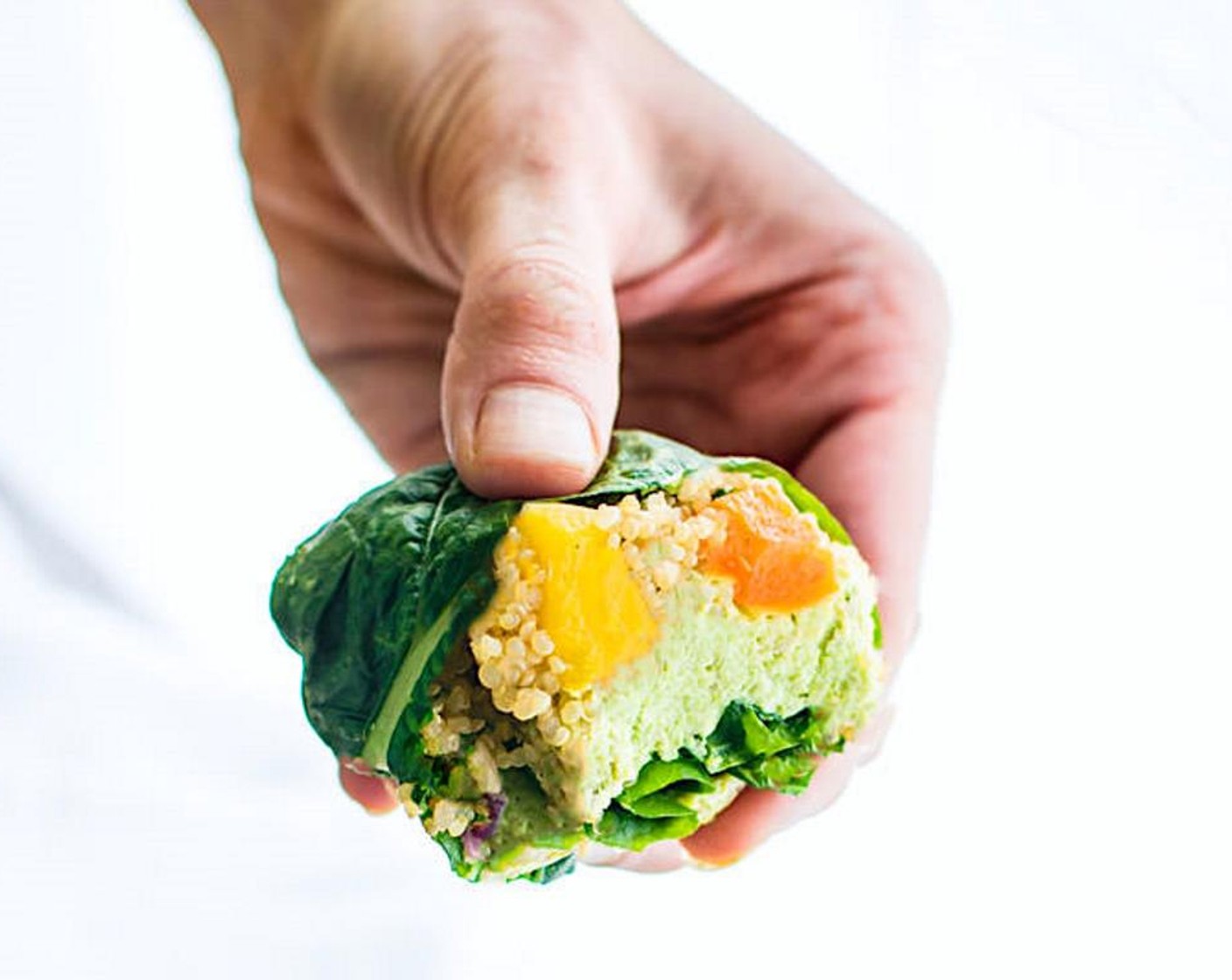Glutenfreie kalifornische Grünkohl-Wraps mit Edamame-Pesto. Ein köstlicher veganer Quinoa-Salat, eingewickelt in gesundem Grünzeug. Das Pesto fügt eine Menge pflanzliches Protein hinzu, was dies zu einem nahrhaften Power-Lunch oder Picknick-Snack macht!