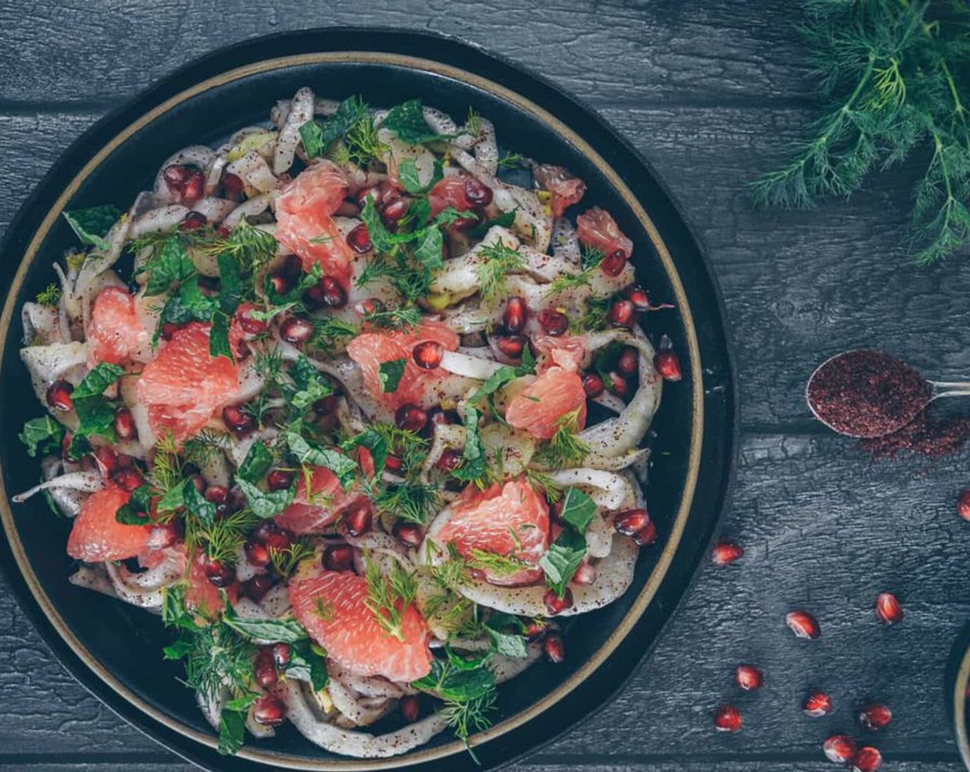 Vitaminbombe! Fenchel, Grapefruit und Granatapfel enthalten gleich ganz viele davon. Dieser Fenchelsalat an einem Zitronen-Sumach-Dressing mit viel Dill und Pfefferminze schmeckt herrlich fruchtig und frisch. Der Burrata gibt einen schönen Ausgleich zu den fruchtig-sauren Elementen.