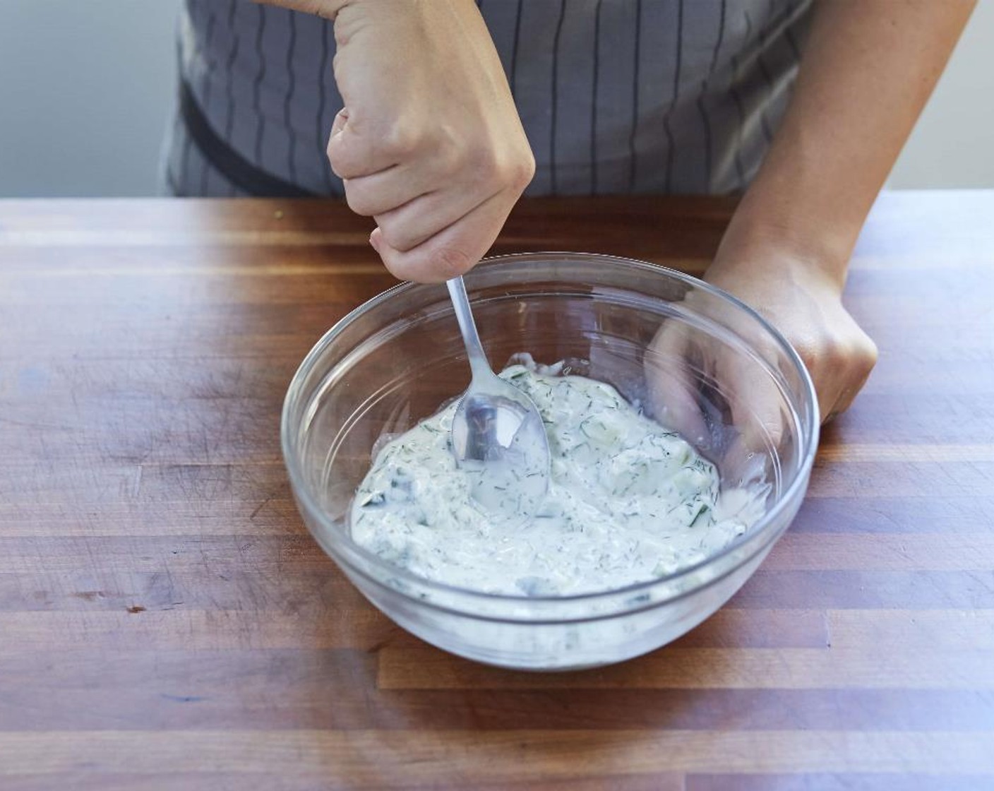 Knoblauch (2 Zehen) fein hacken und zur Gurke geben. Die Stiele vom frischen Dill (9 g) entfernen und wegwerfen. Dill fein hacken und mit in die Schüssel geben.