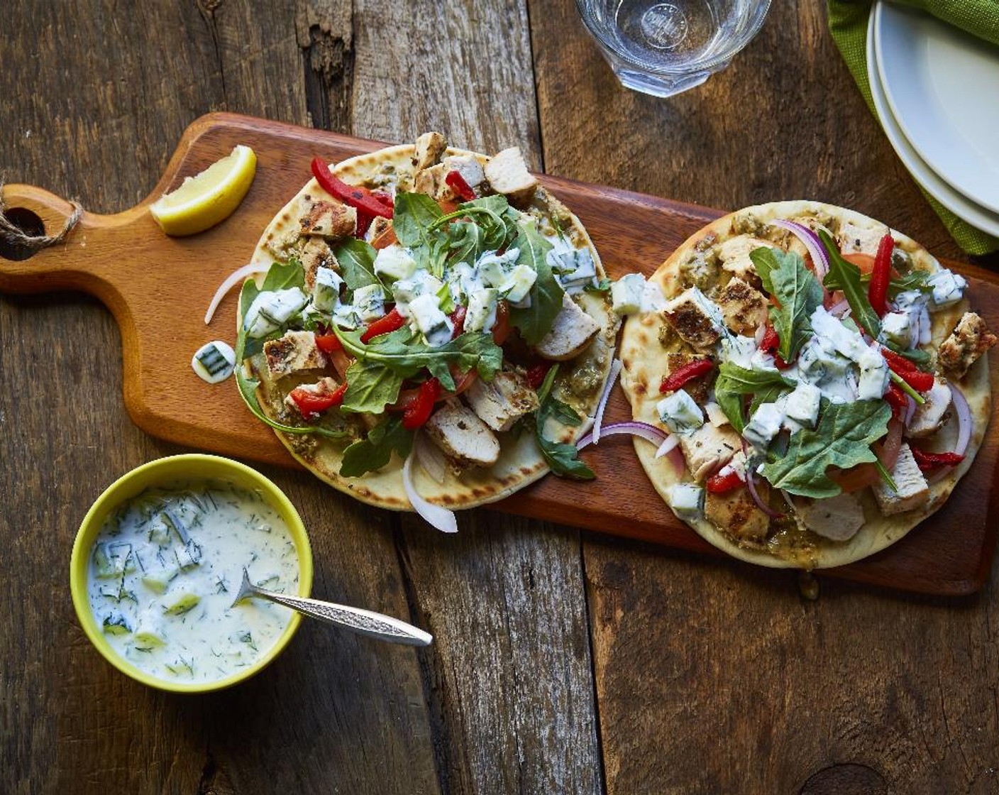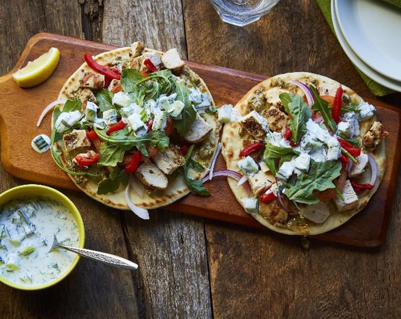 Das Fleisch in etwa 3 cm grosse Würfel schneiden. 1 Löffel der Marinade in der Mitte jeder warmen Pita verteilen. Darauf die gegrillten Fleischtücke legen. Zwiebeln, Tomaten und rote Chilis (85 g) gleichmässig auf dem Fleisch verteilen..