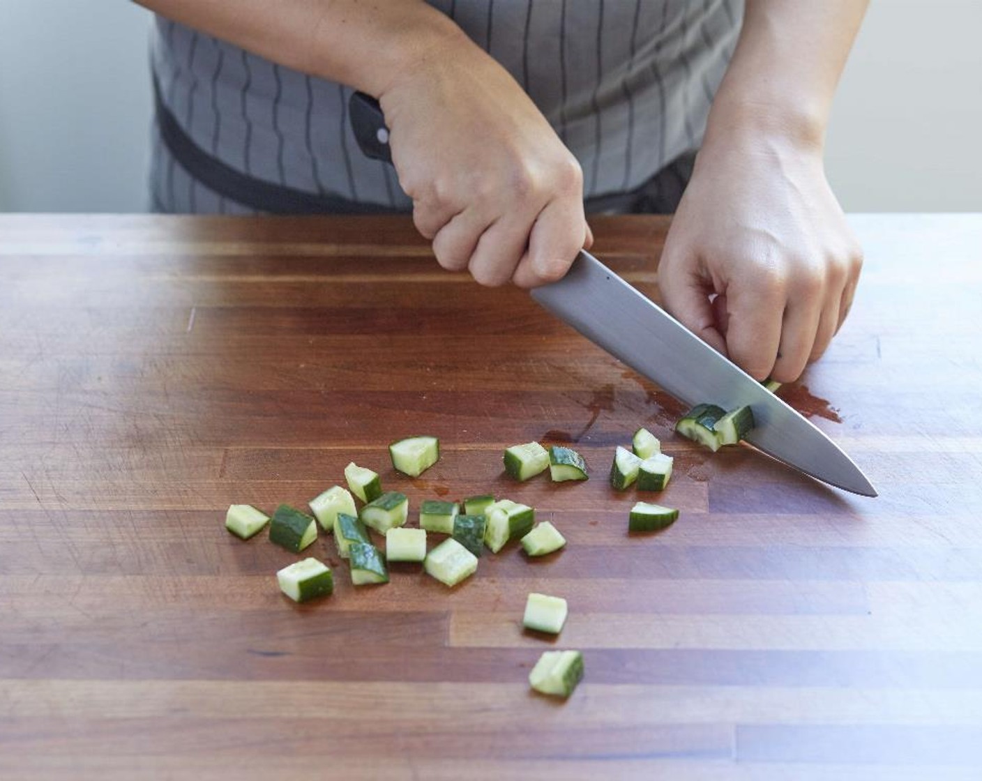 Die Mini Gurke (1) längs halbieren und dann in etwa 0,5 Zentimeter grosse Würfel schneiden. In eine mittelgrosse Schüssel geben.