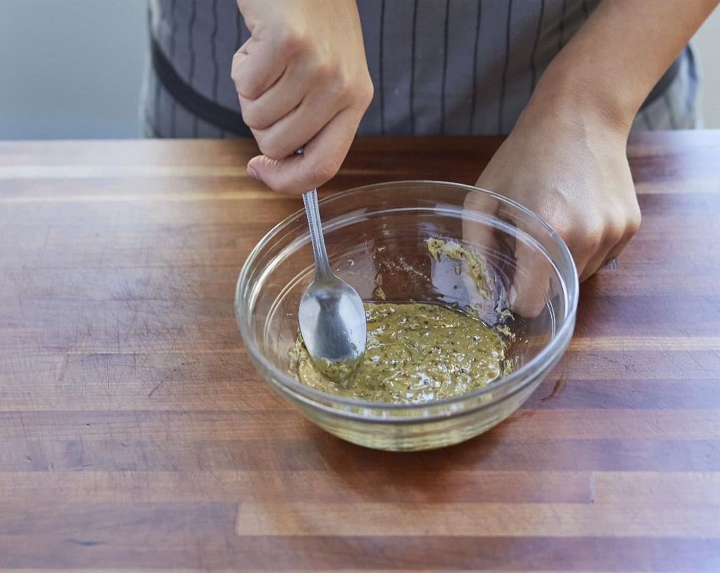 Dijon Senf (1 EL), Oregano (1 TL), Salz (1/4 TL) und Pfeffer (1/4 TL) einrühren.