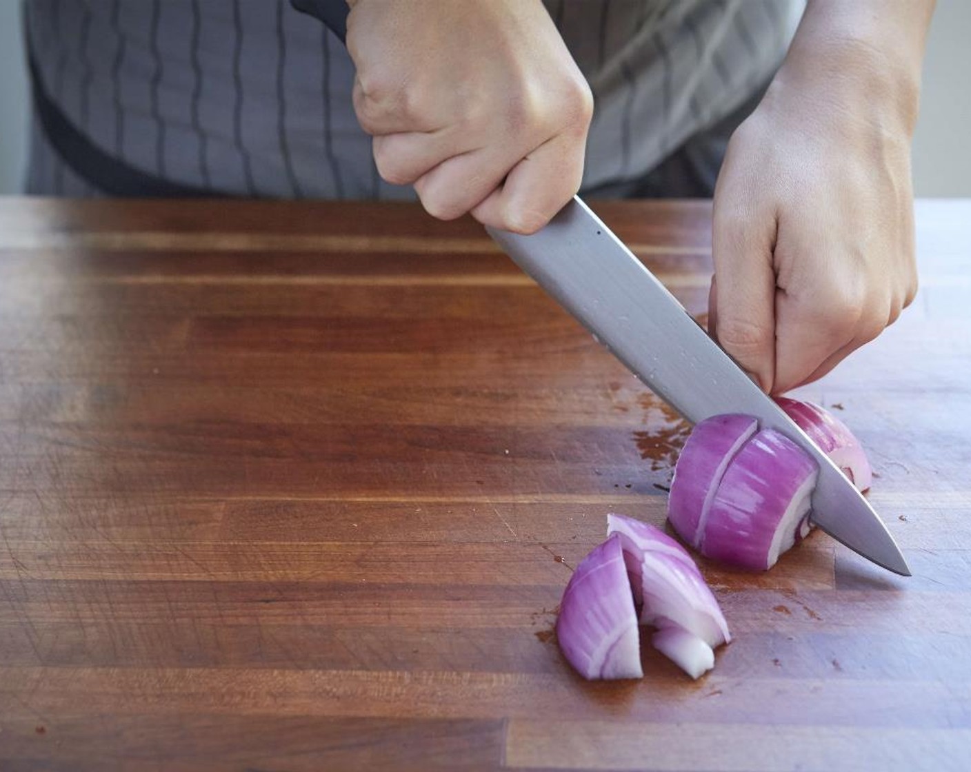 Tomate (1) in 3 Zentimeter grosse Scheiben schneiden und beiseitelegen. Zwiebel (1) schälen, in Scheiben schneiden und in eine andere mittelgrosse Schüssel geben.
