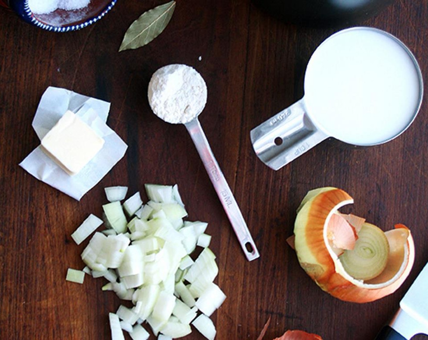Die Sauce abschmecken und länger kochen, wenn der Geschmack von Mehl noch zu erkennen ist. Die Mischung sollte dickflüssig sein. Wenn sie zu dickflüssig ist und sich schwer rühren lässt, etwas mehr Milch einrühren. Das Lorbeerblatt entfernen und wegwerfen.