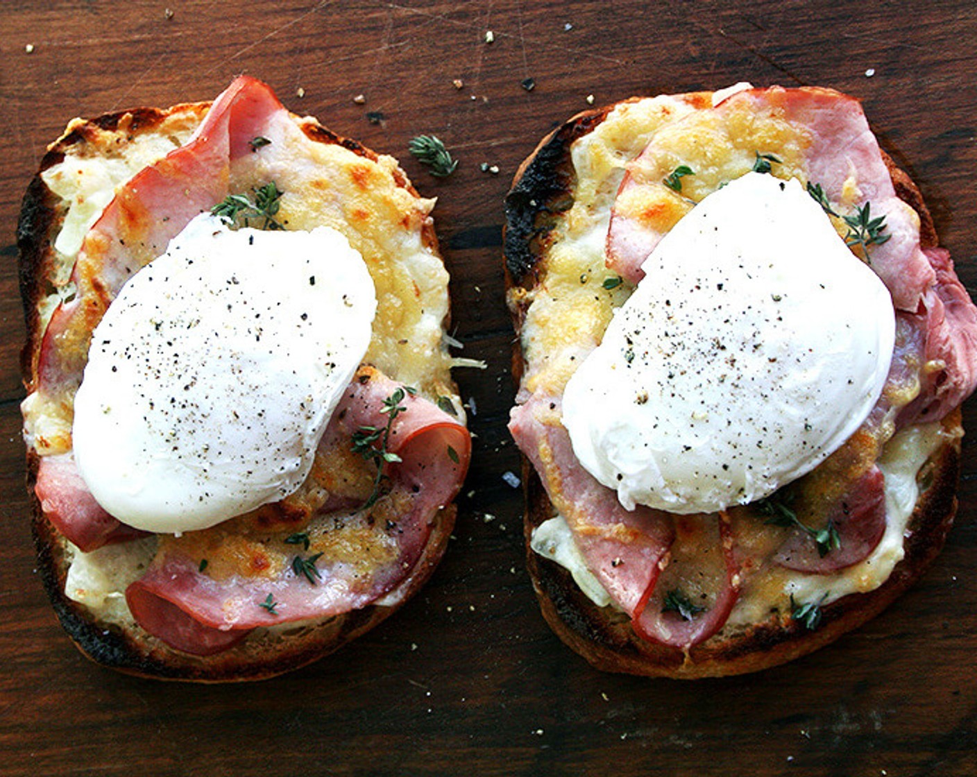 Wenn die Eier 3 Minuten gekocht haben, die Toasts unter den Grill schieben und so lange backen, bis der Käse Blasen wirft und zu bräunen beginnt. Aus dem Ofen nehmen. Mit Thymian (wenig) bestreuen.