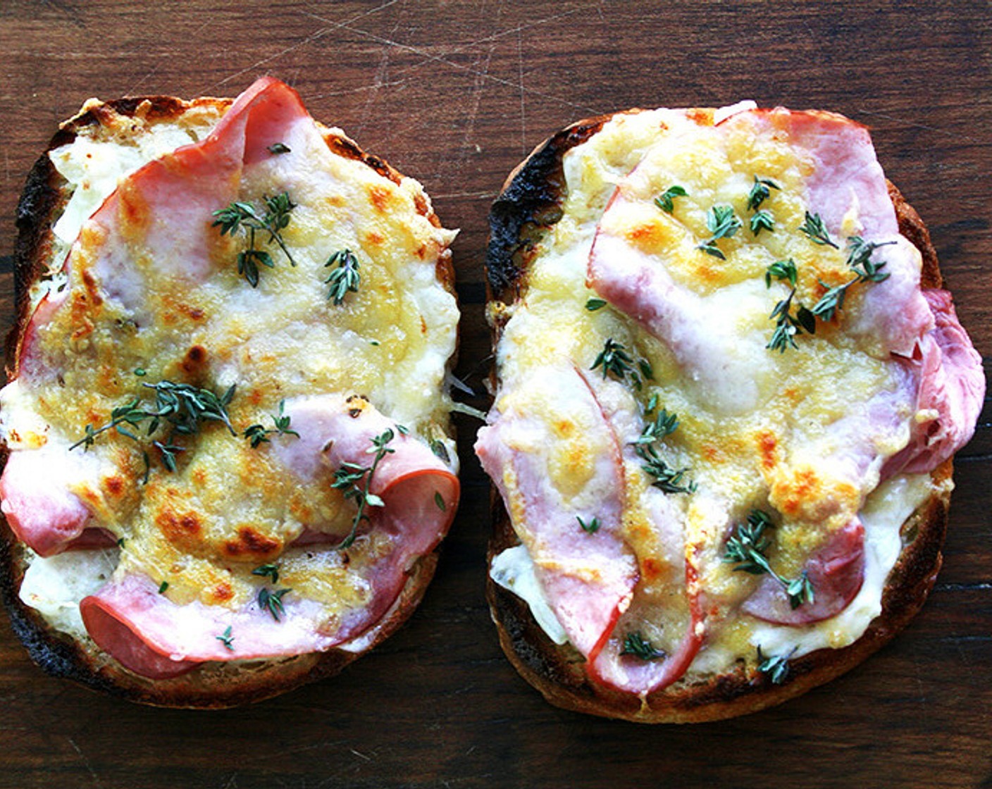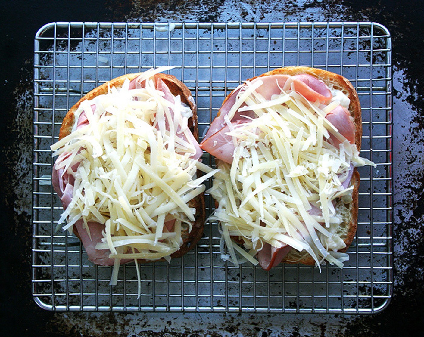 Jede Brotscheibe mit ca. 1 Esslöffel Béchamel bestreichen. Mit Schwarzwälder Schinken (4 Scheiben) und Gruyère (wenig) belegen. Beiseite stellen.