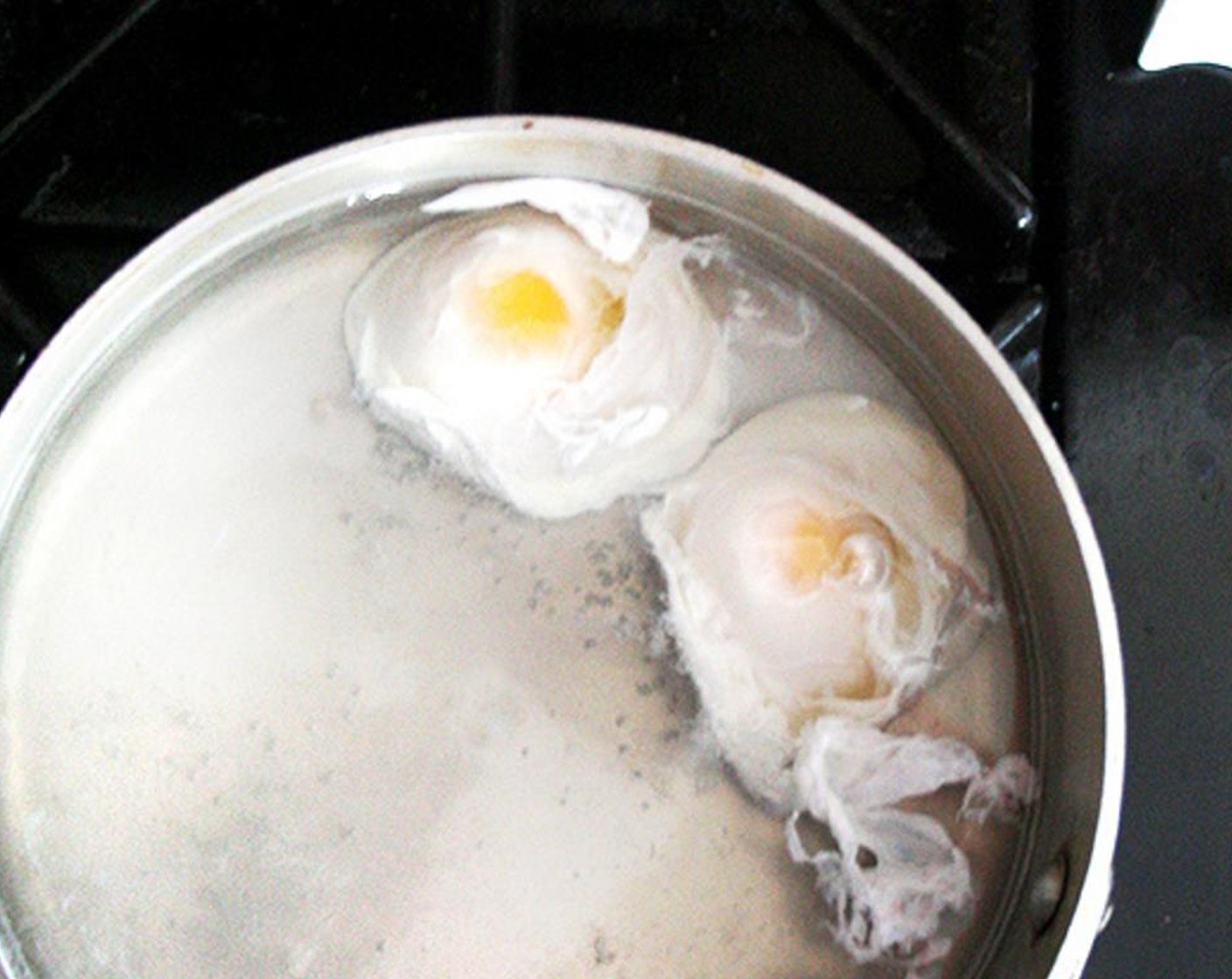 Den Stiel eines Holzlöffels benutzen, um einen Strudel im Wasser zu erzeugen, und dann ein Ei in die Mitte des Strudels fallen lassen. Den Vorgang mit dem anderen Ei wiederholen. Die Hitze so einstellen, dass das Wasser knapp unter dem Siedepunkt bleibt. Den Timer auf 3 Minuten einstellen.