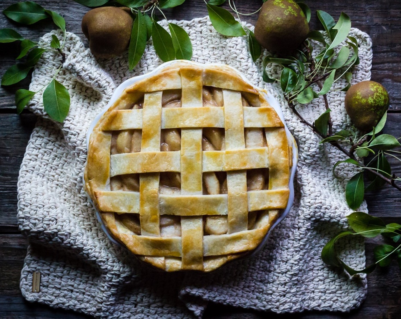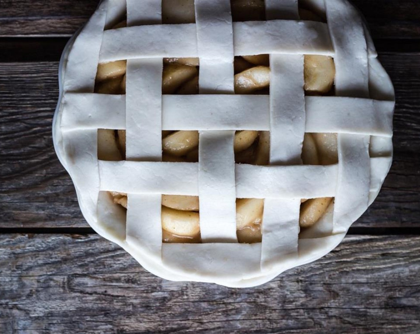 Wenn das Gitter fertig ist, die vorbereitete Wähenform aus dem Kühlschrank nehmen, die Birnen gleichmässig darauf verteilen.