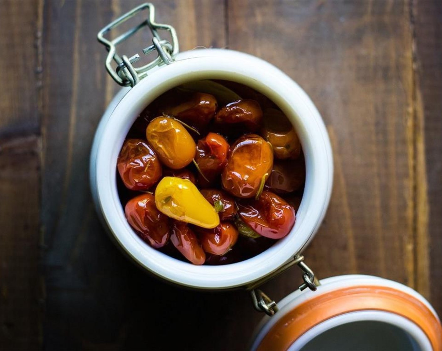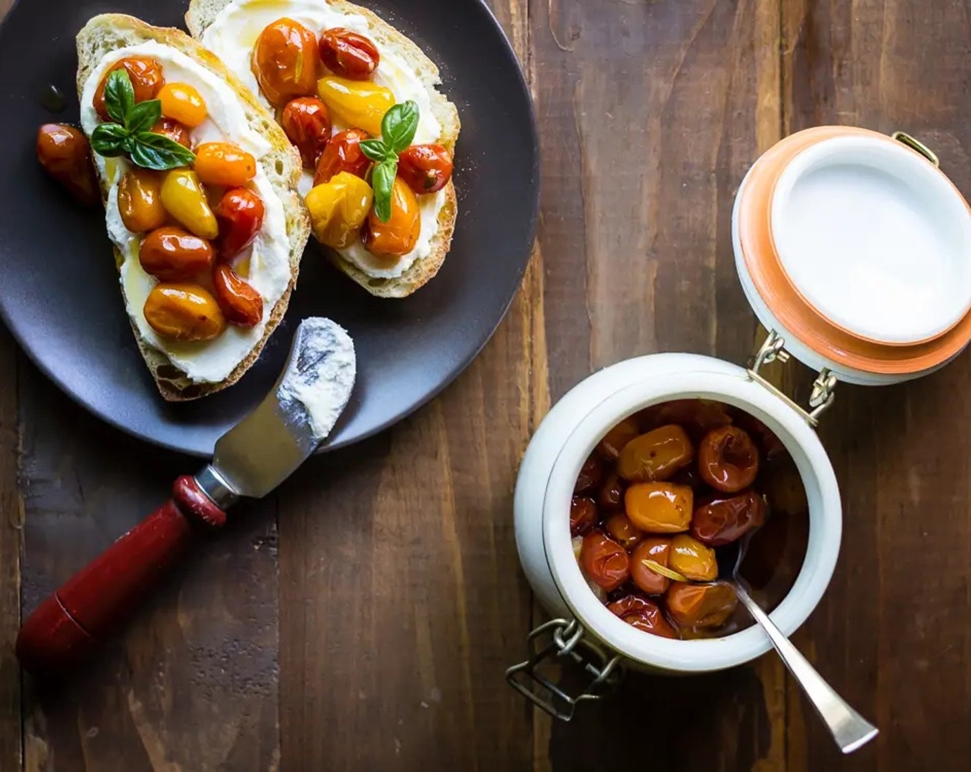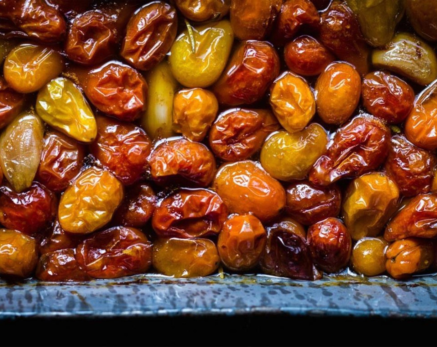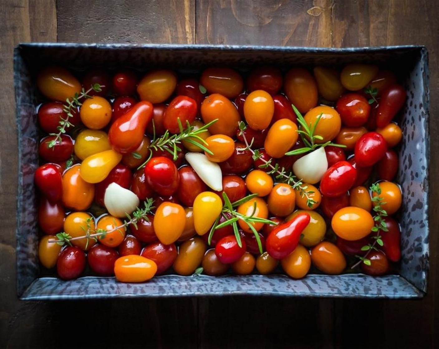 Confit (sprich: con-FEE) ist eine Kochtechnik, bei der Lebensmittel langsam in Flüssigkeit gegart werden. In diesem Fall werden Cherrytomaten in einem Bad aus Olivenöl zusammen mit Knoblauch, Rosmarin, Thymian und Salz langsam gegart. Durch diesen Vorgang werden sie zu weichen, köstlichen kleinen Juwelen, die einem förmlich auf der Zunge zergehen.