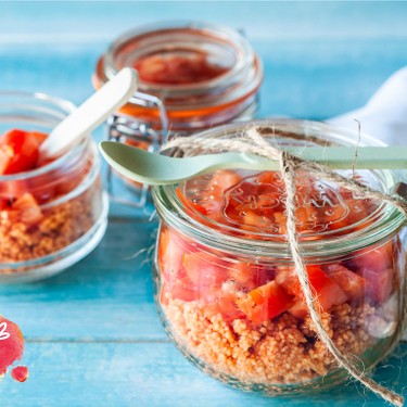 Couscous-Salat ist ein Sommerklassiker! Dieses Tomaten-Couscous im Glas ist schnell zubereitet. Das ideale Menü für unterwegs; ob im Büro, in der Badi oder beim Picknick. Das Couscous nach Belieben mit Zutaten wie Gurken, Granatapfelkernen, Fetakäse, Oliven, Pfefferminzblätter ergänzen.
