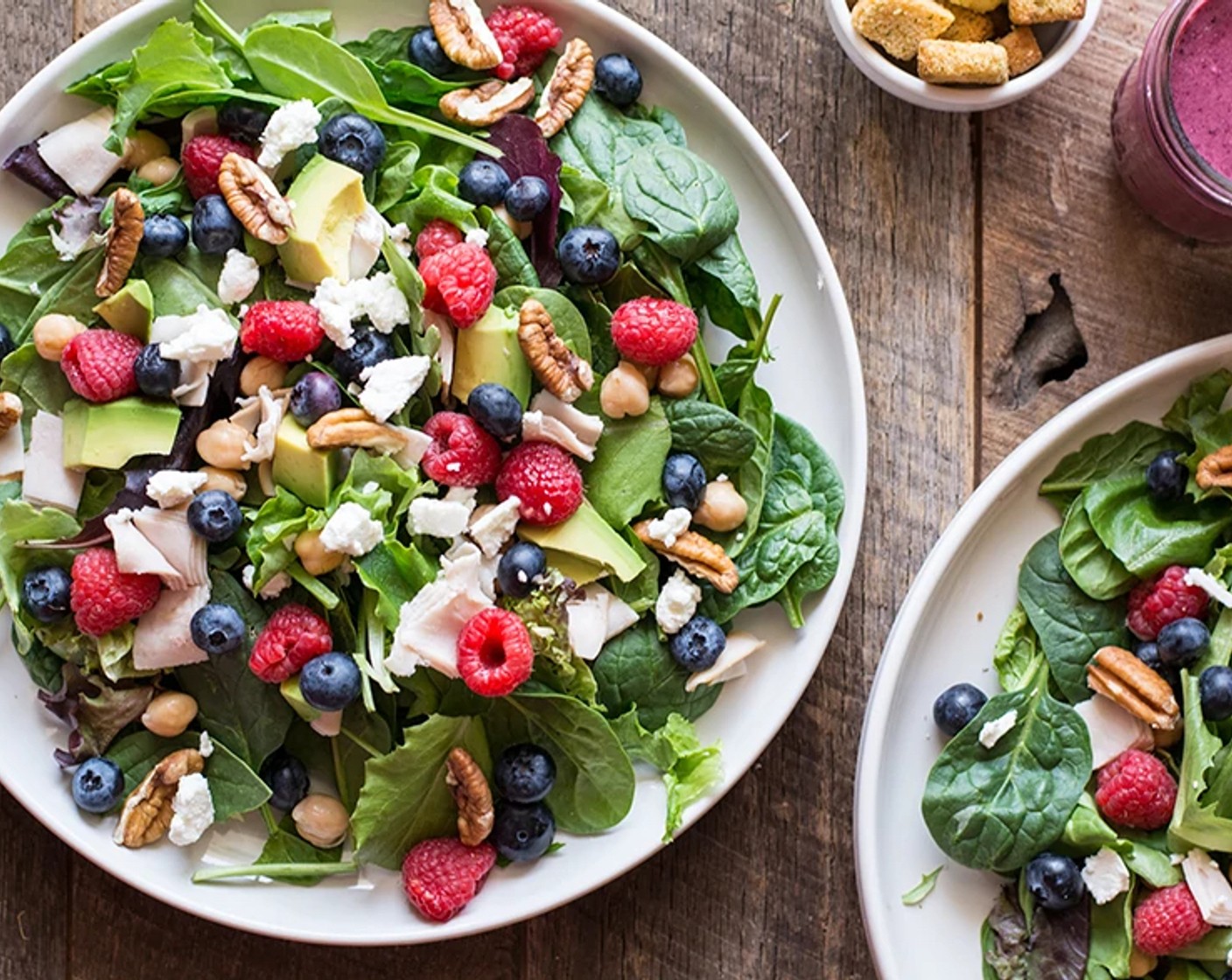 Für den Salat, Frühlingssalat-Mix (70 g), Spinat (60 g), Heidelbeeren (75 g), Himbeeren (60 g), Pekannüsse (4 Esslöffel), Kichererbsen (100 g), Avocado (1/2), Putenbrust-Aufschnitt (4 Scheiben) und Ziegenkäse (55 g) in grossen Schüsseln oder Tellern schichten und gleichmässig verteilen.
