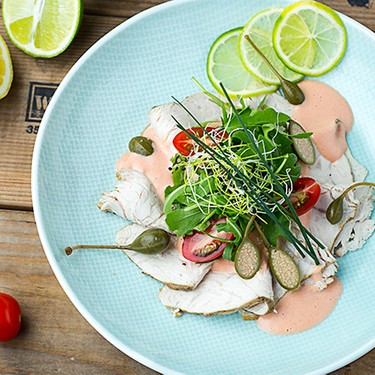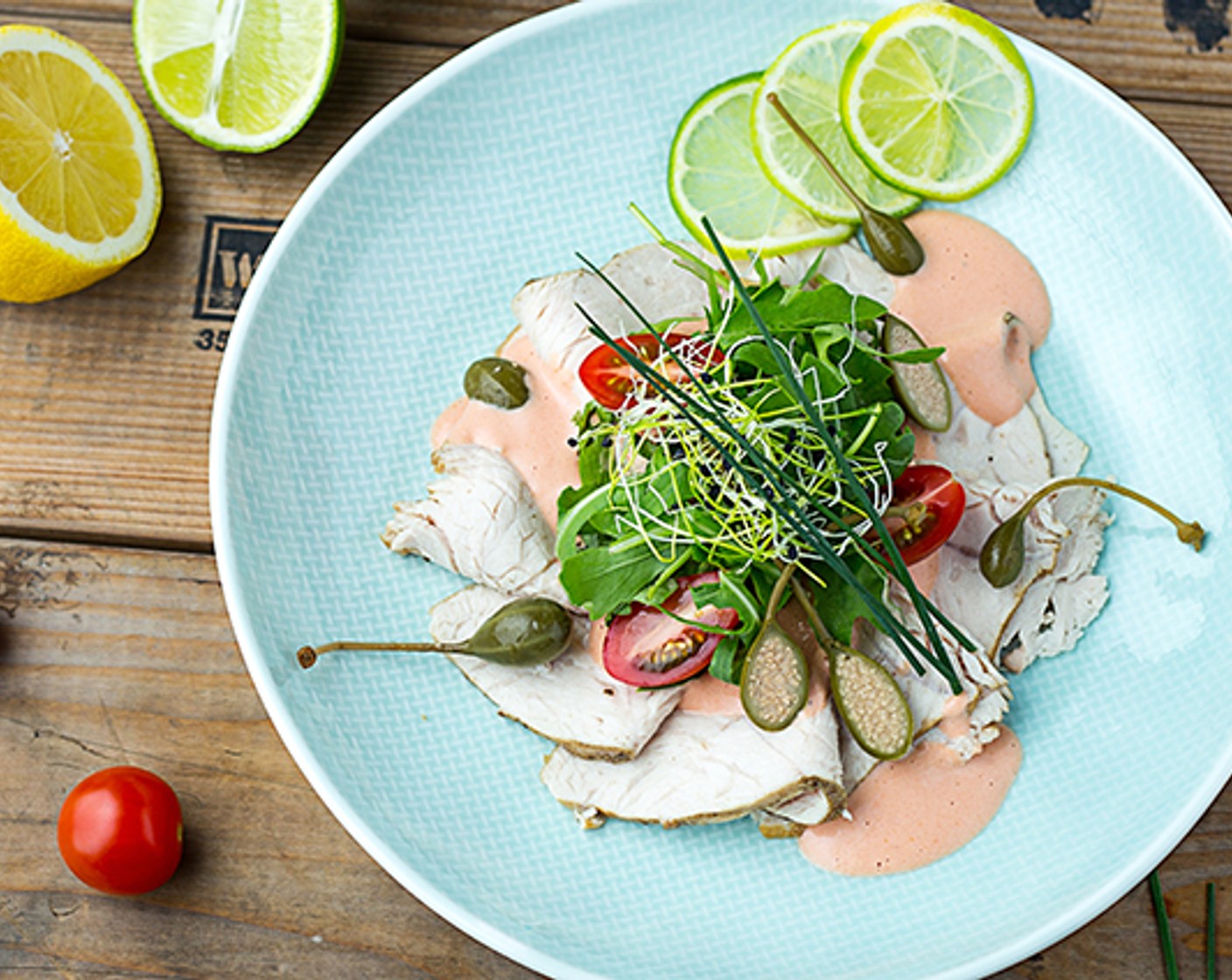 Eine hervorragende Abwandlung des Klassikers «Vitello tonnato» mit Truthahnbrust und einer würzigen Tomaten-Joghurt-Sauce.