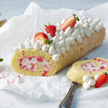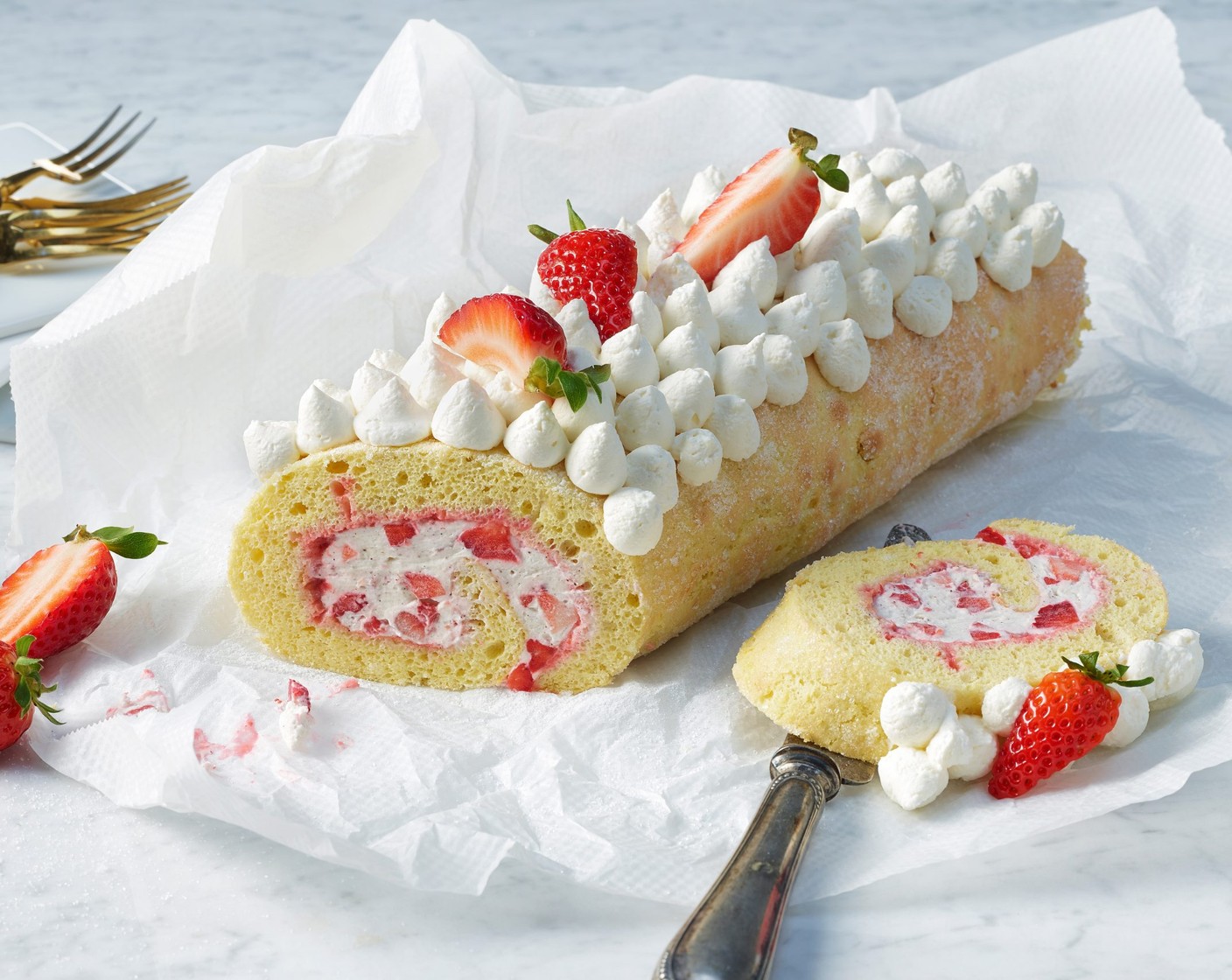 Luftiger Biskuitboden, Schweizer Erdbeeren und Schlagrahm. Mit dieser Schritt-für-Schritt-Anleitung in Bildern gelingt diese Biskuitroulade perfekt.