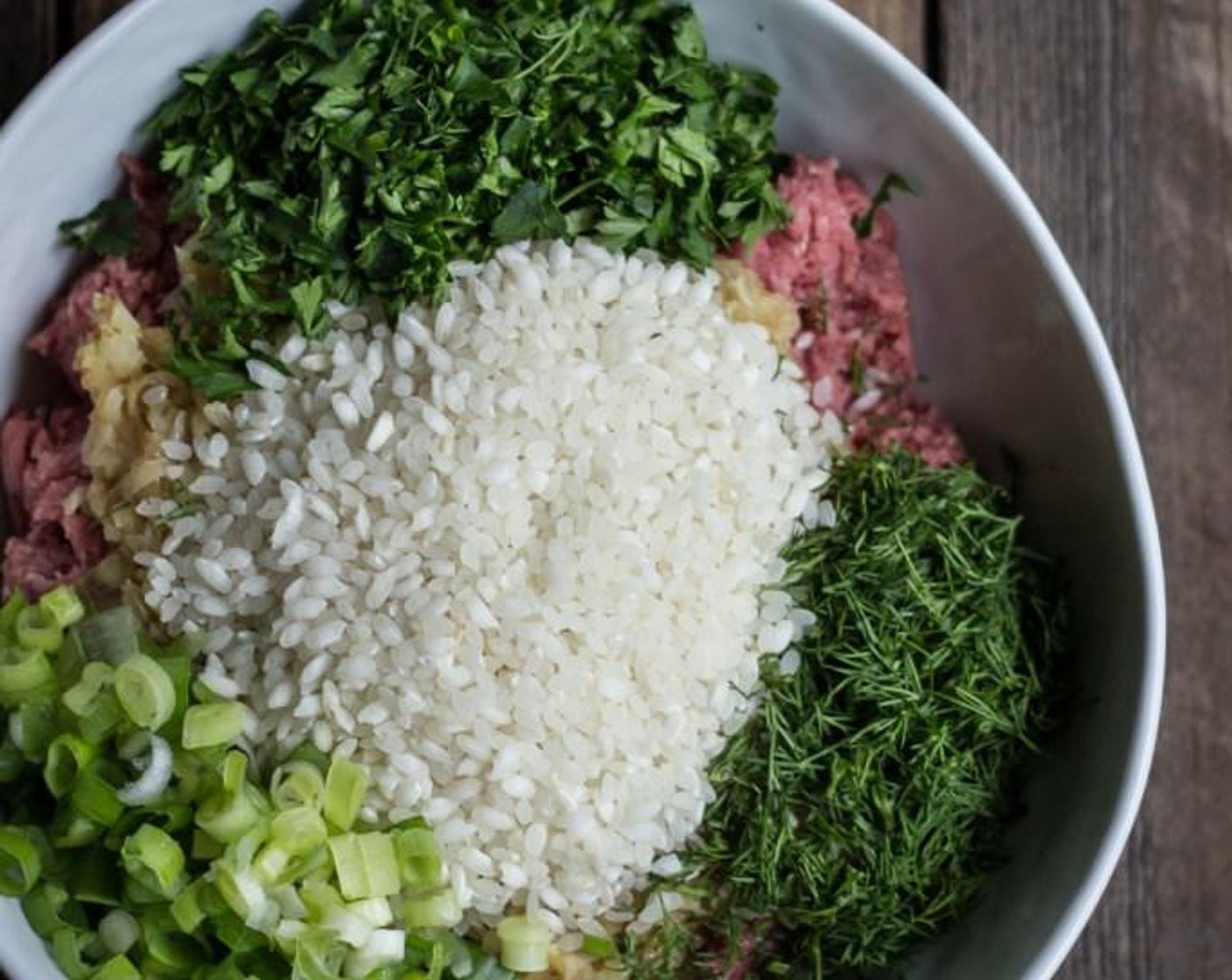 Hackfleisch (455 g), Reis (100 g), frischen Dill (4 Esslöffel), frische Petersilie (4 Esslöffel), Bundzwiebeln (2), Zwiebeln, Knoblauch, Salz (wenig) und Pfeffer (1/2 TL) in eine Schüssel geben und gut mischen.