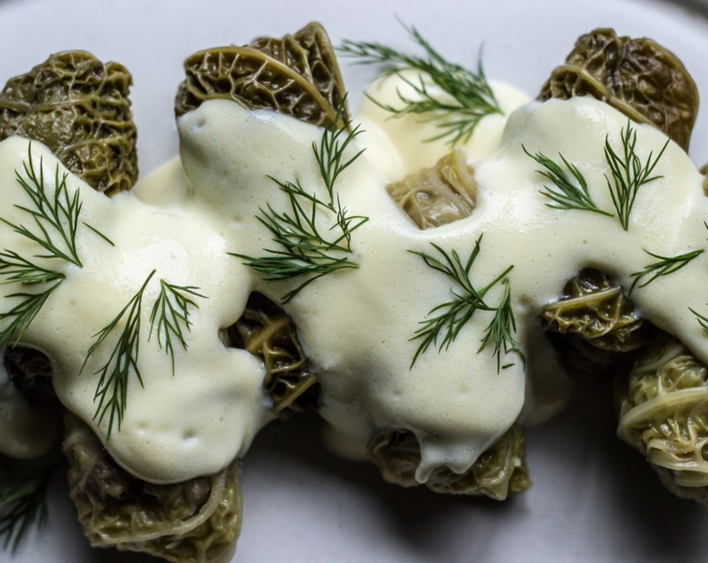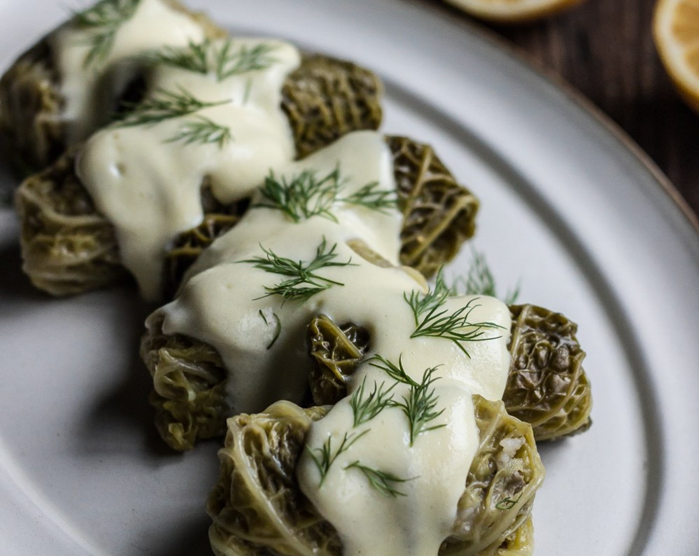 Sauce über die fertigen Kohlrouladen geben und mit frischem Dill (wenig) garnieren.