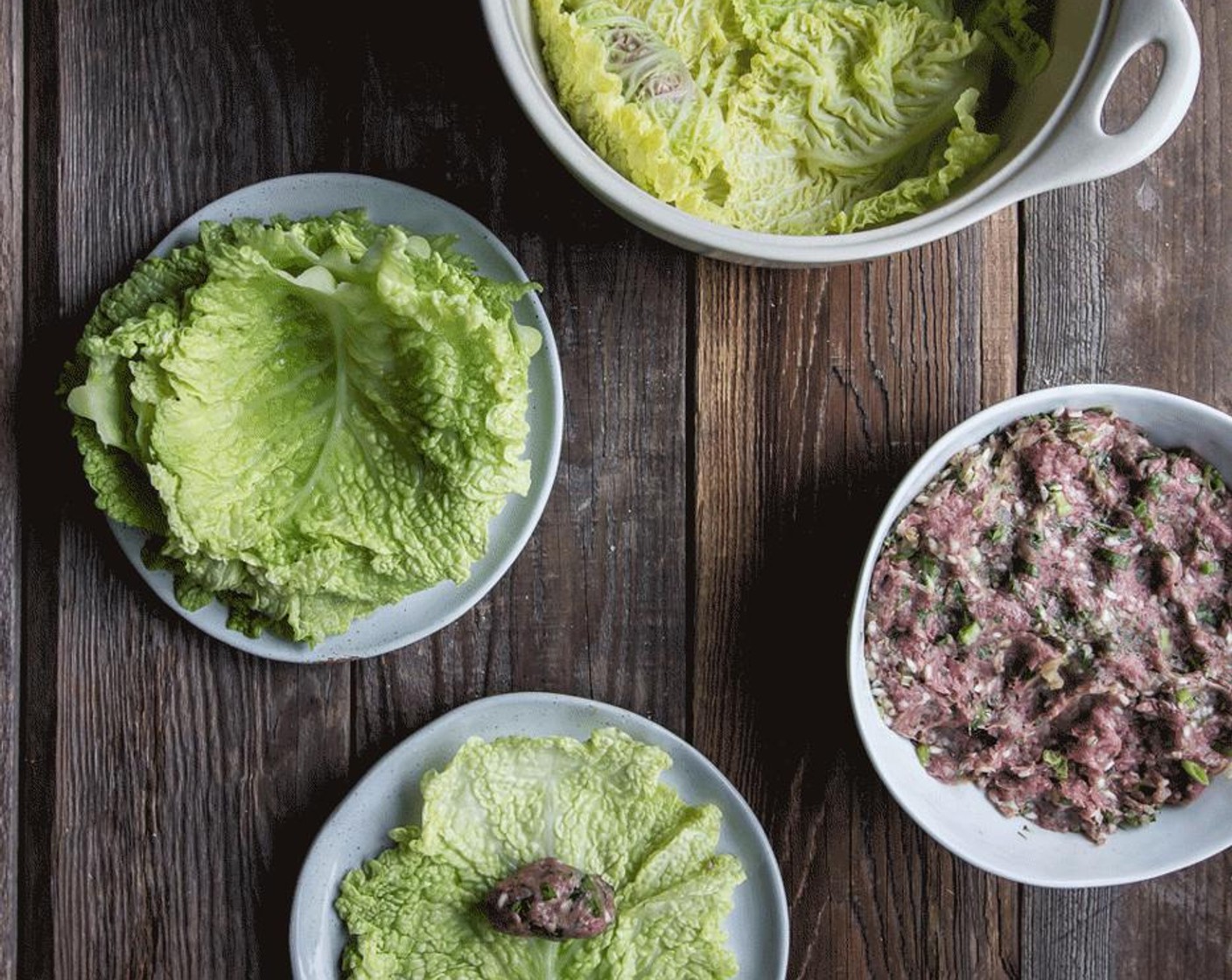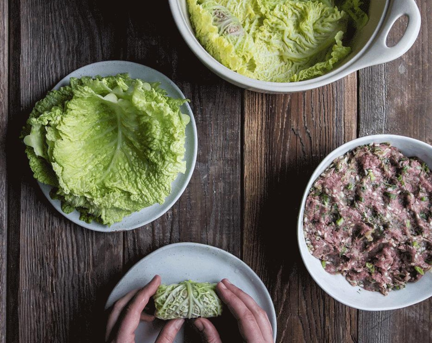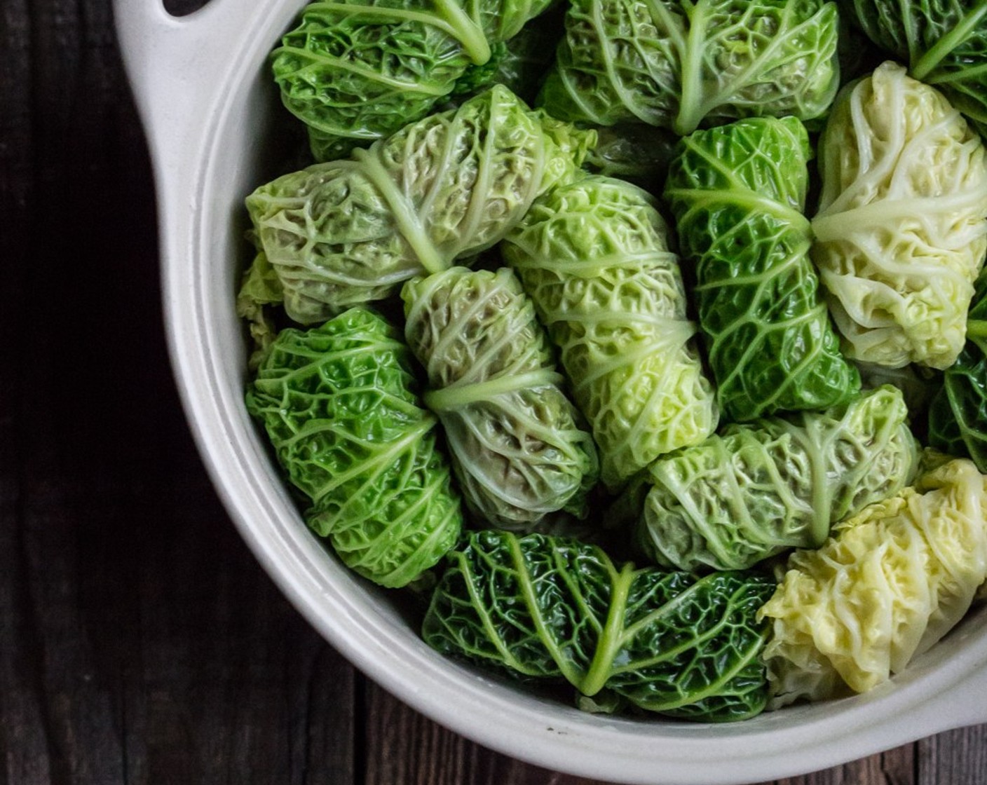 Aus dem Topf nehmen, die weichen Blätter entfernen und diesen Vorgang so lange fortsetzen, bis alle Blätter weich geworden sind. Von jedem Kohlblatt den dicken Teil der Hauptrippe mit einem Messer entfernen und besonders grosse Blätter gegebenenfalls in Hälften schneiden.