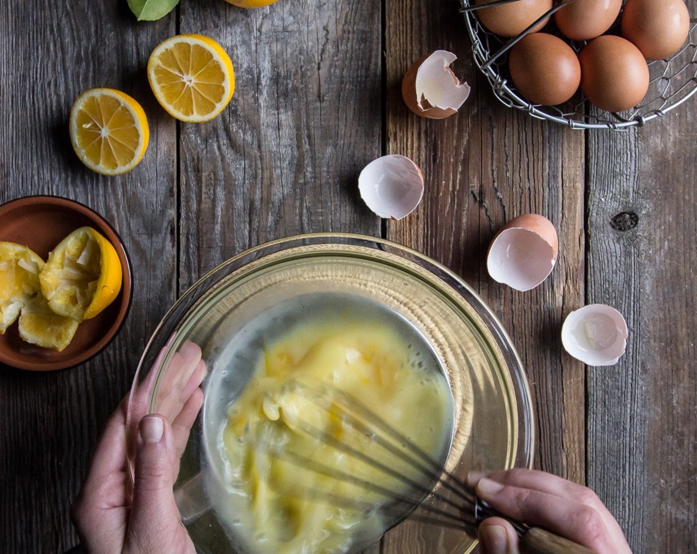 In einer hitzebeständigen Schüssel über einem kleinen Topf mit kochendem Wasser Eier (4), Zitronensaft (1) und Salz (wenig) hinzufügen und rühren.
