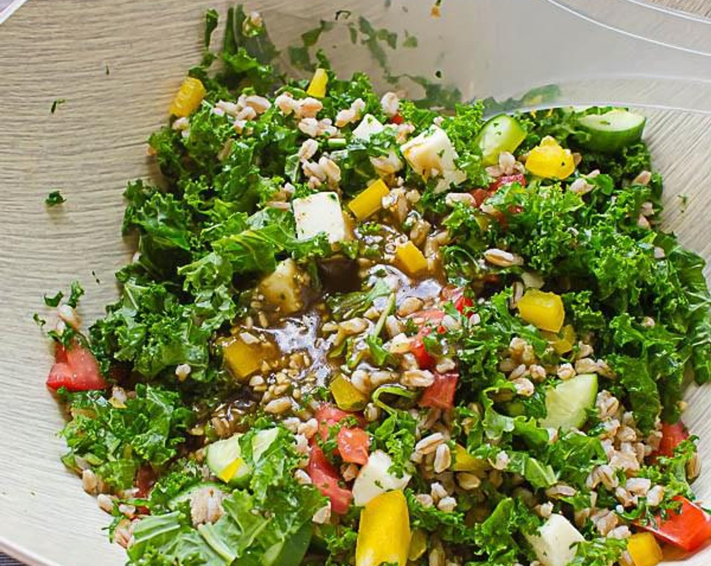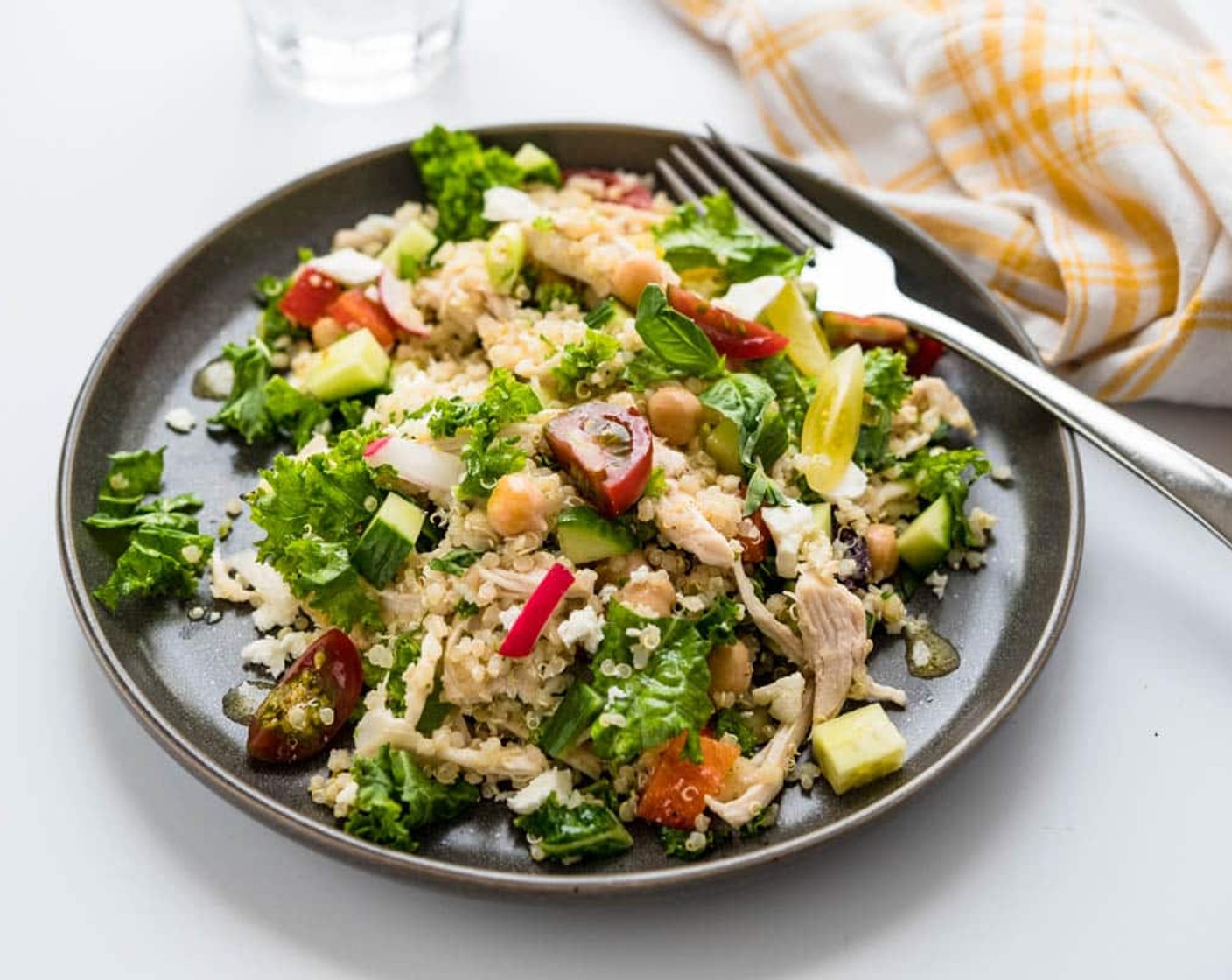 Dieses Rezept für einen gesunden Quinoa-Salat ist würzig, leicht und sehr sättigend. Mit seinen mediterranen Aromen ist dieser Poulet-Grünkohl-Quinoa-Salat tagelang haltbar und eignet sich hervorragend als Lunchpaket für zwischendurch, aber auch für eine grössere Gruppe.