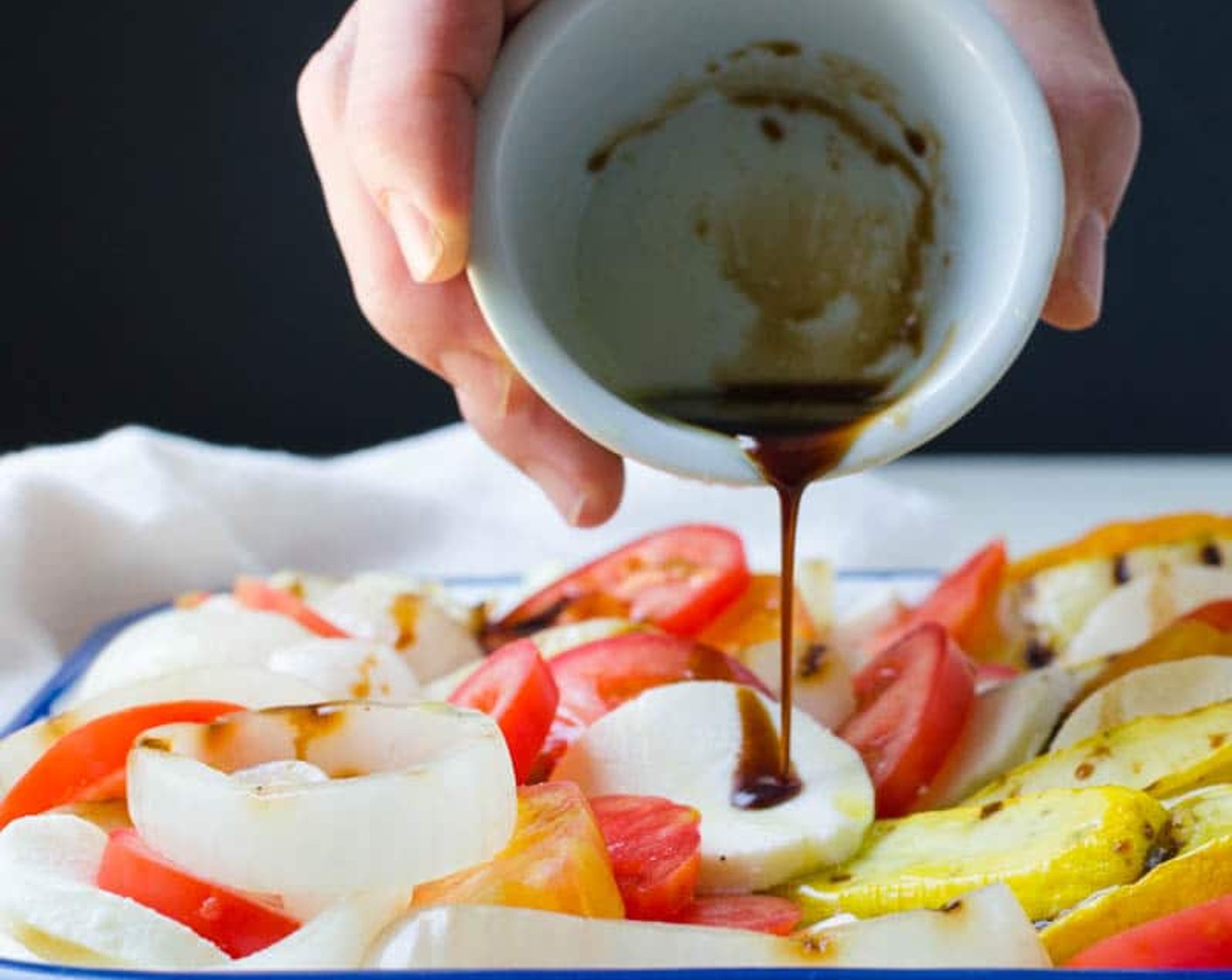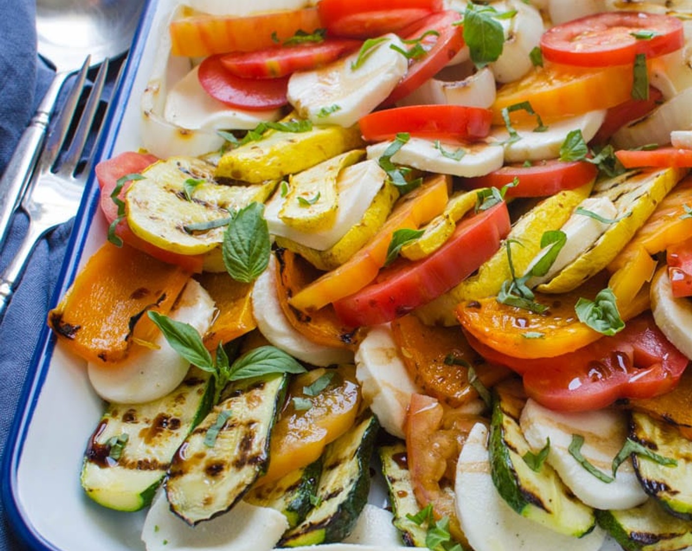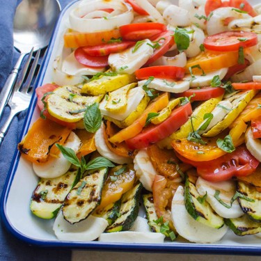 Gekühlt oder bei Zimmertemperatur serviert, ist diese leckere Variante des Caprese-Salats die perfekte Beilage für ein sommerliches Barbecue oder eine Grillparty.