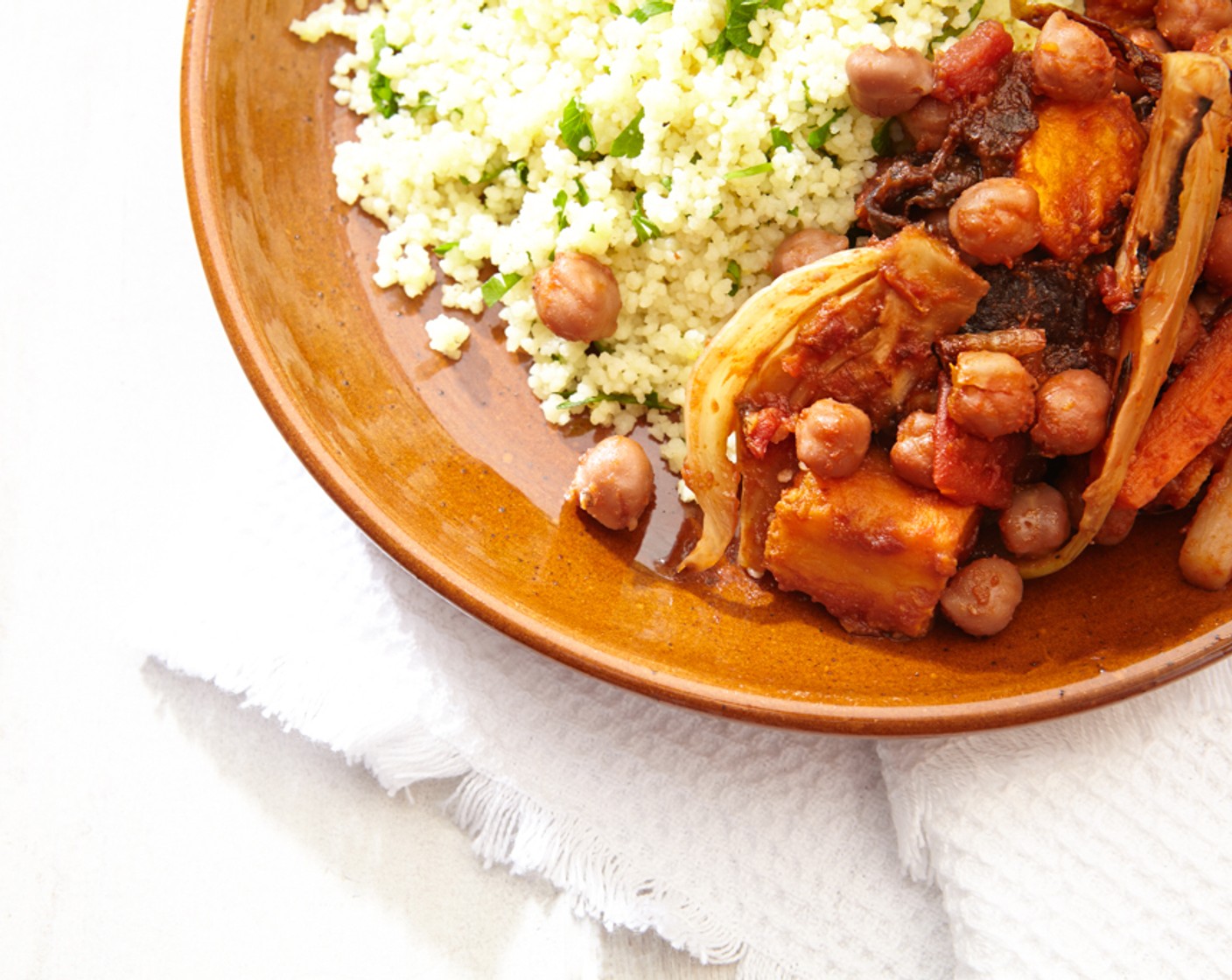 Zum Schluss das orientalische Gemüse zusammen mit dem Couscous anrichten. Harissa (nach Bedarf) und Joghurt (150 g) dazu servieren.